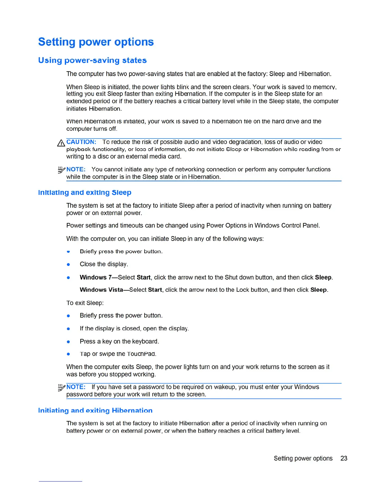 HP 8460p - Setting Power Options; Using Power-Saving States; Initiating and Exiting Sleep; Initiating and Exiting Hibernation