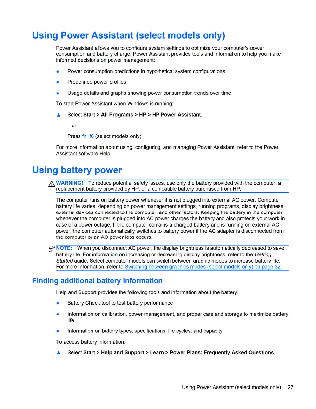 HP 8460p - Power Assistant and Battery Information; Battery Check and Low Battery Handling