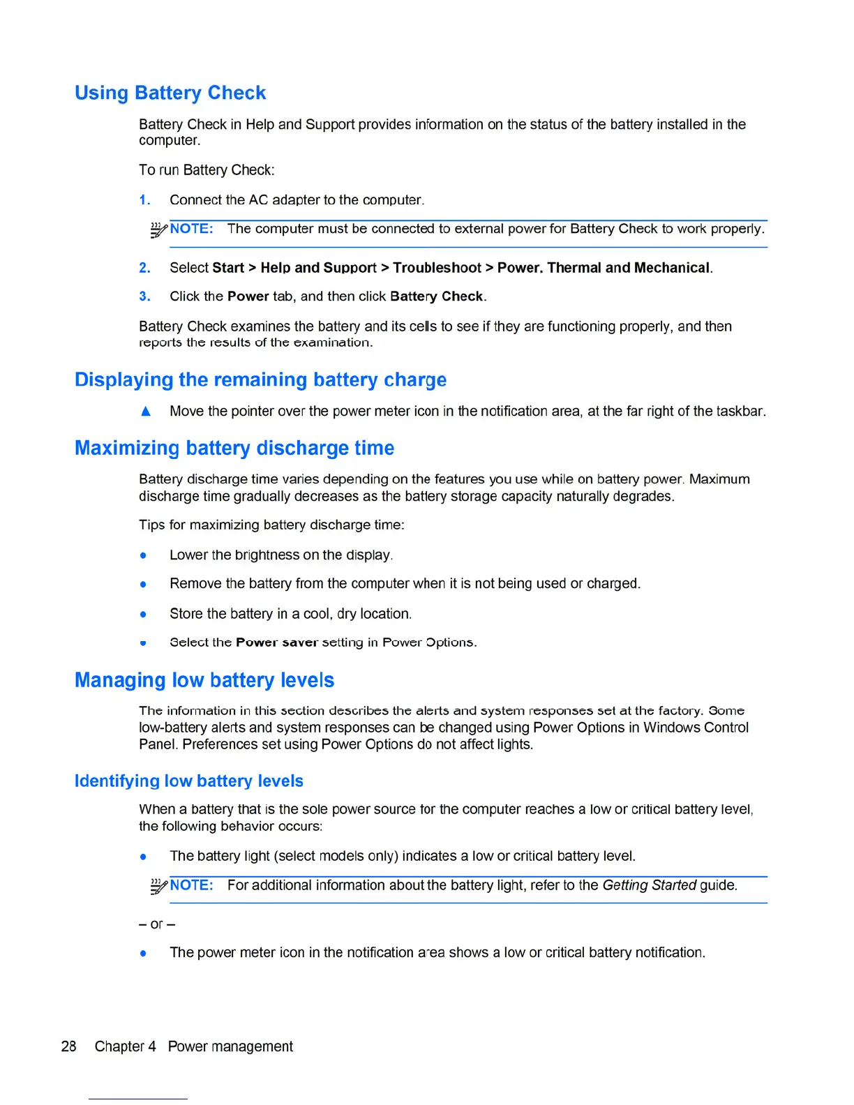 HP 8460p - Using Battery Check; Displaying the Remaining Battery Charge; Maximizing Battery Discharge Time; Managing;Identifying Low Battery Levels