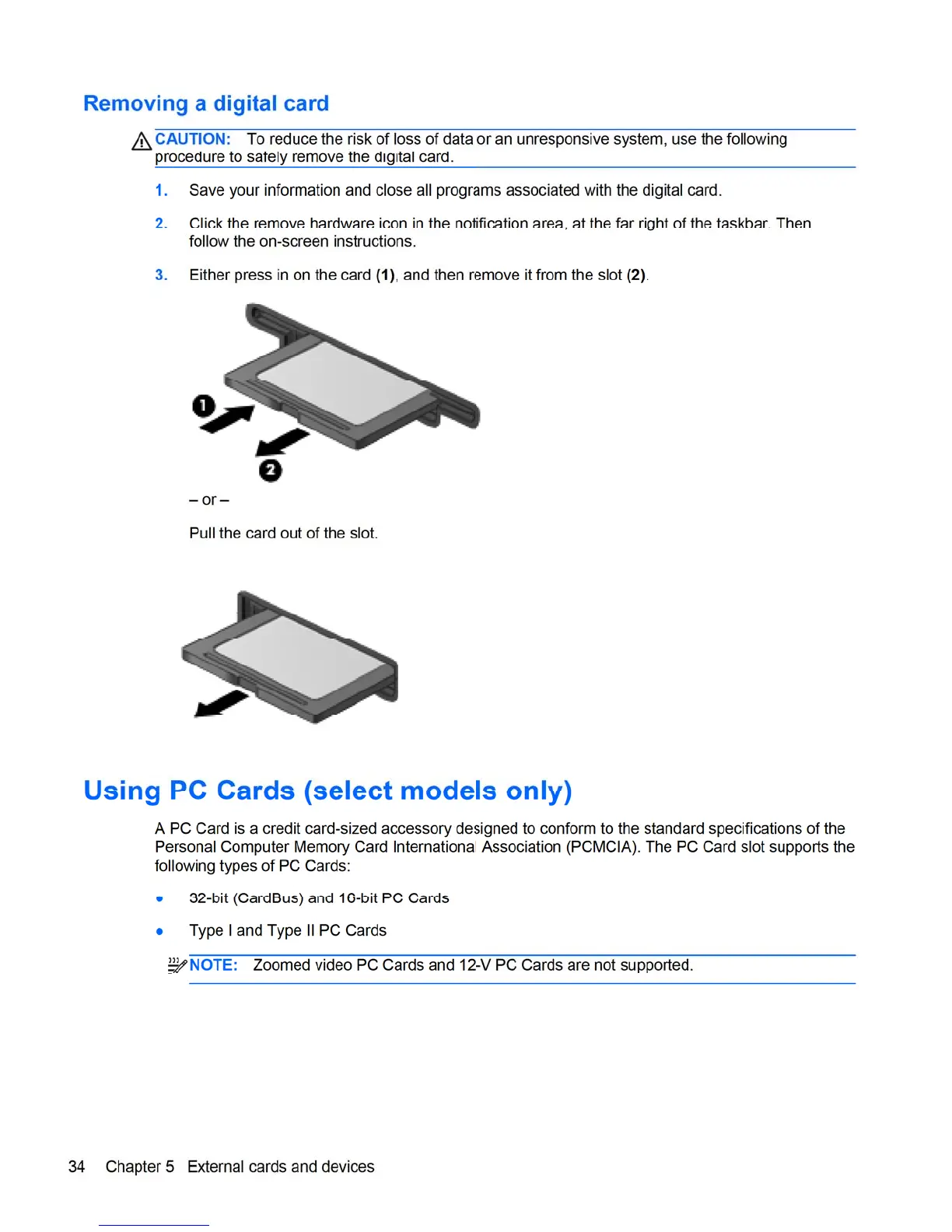HP 8460p - Removing a Digital Card; Using PC Cards