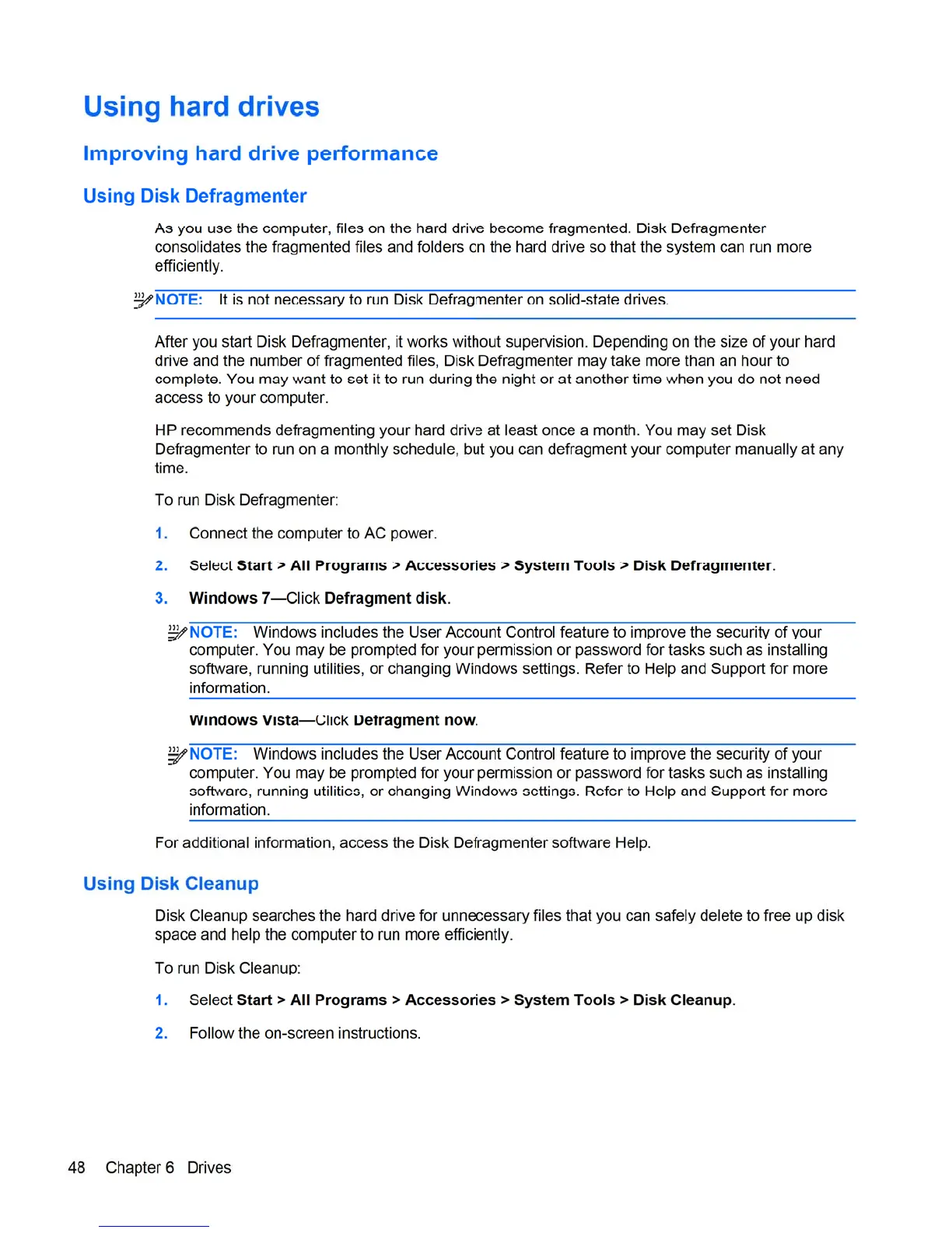 HP 8460p - Using Hard Drives: Using Disk Defragmenter; Using Hard Drives: Using Disk Cleanup