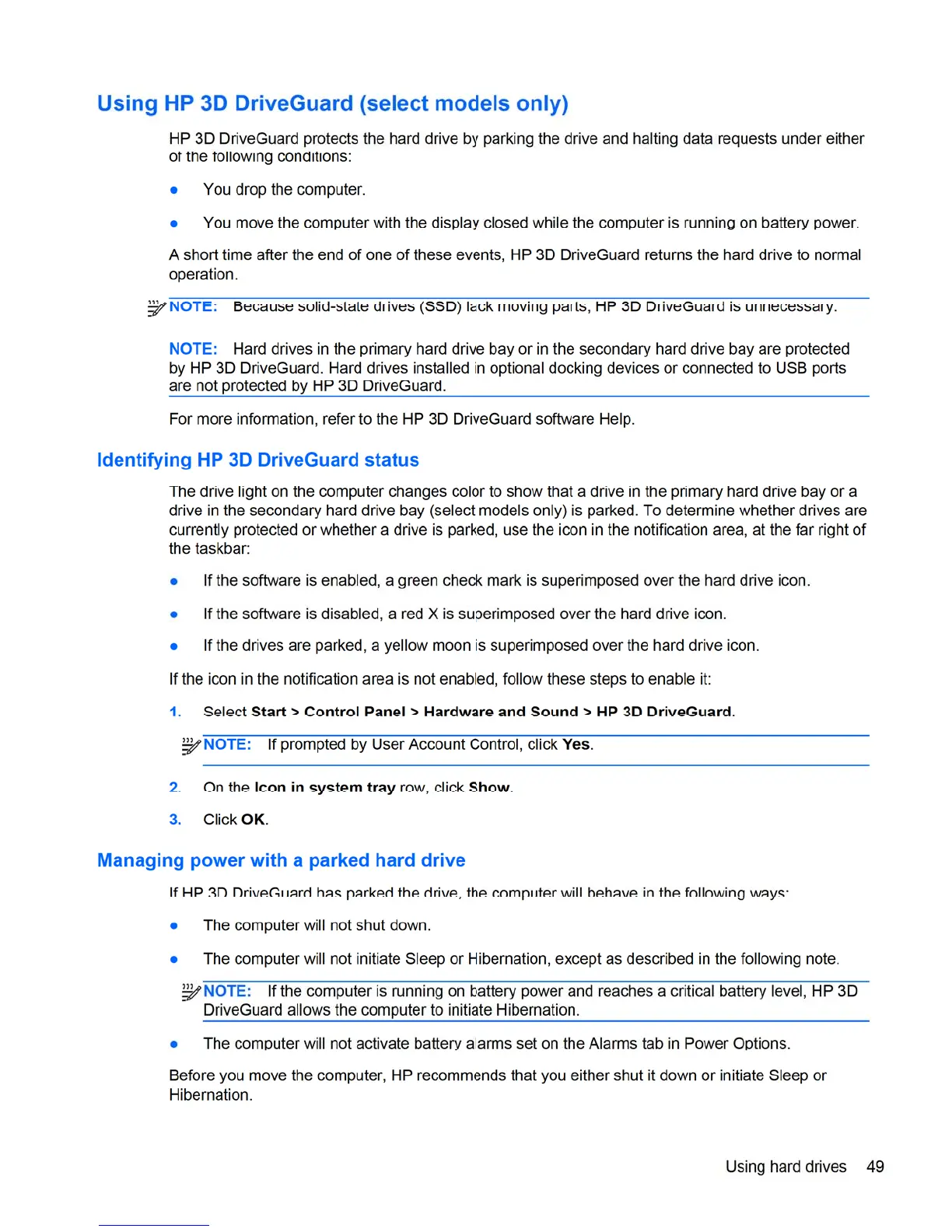 HP 8460p - Using HP 3 D Driveguard; Identifying HP 3 D Drive Guard Status; Managing Power with a Parked Hard Drive