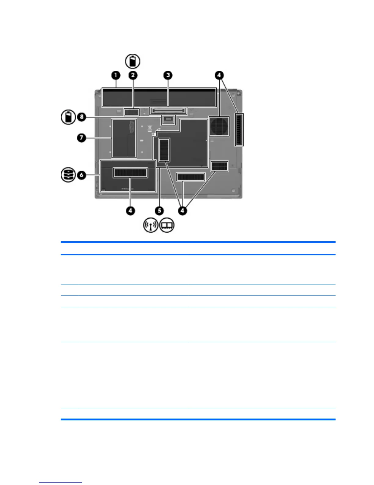 (1) Battery bay Holds the battery and a wireless subscriber identity module (SIM).