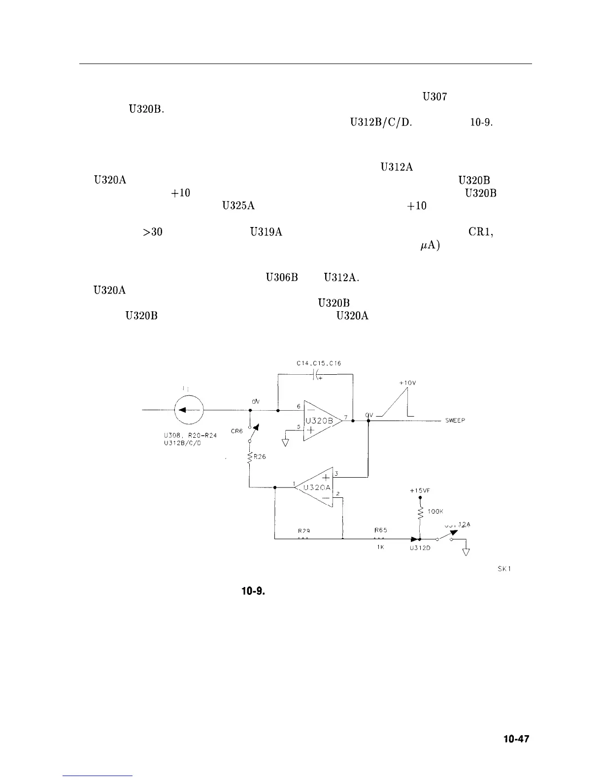 During retrace, HSCAN is low, closing U306B and U312A. See Figure 10-10. The output