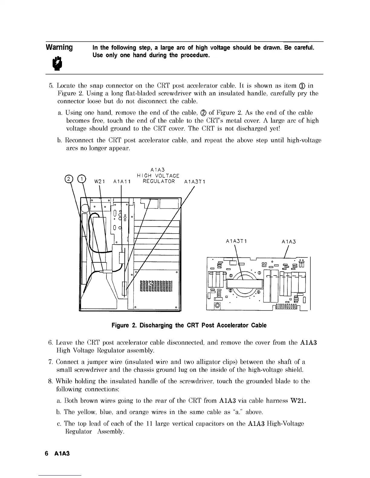 becomes free, touch the end of the cable to the CRT’s metal cover. A large arc of high