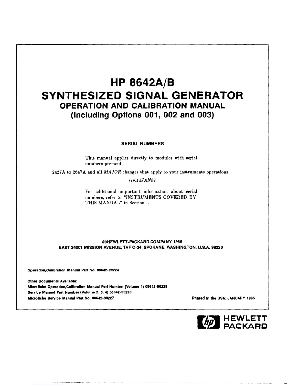 Service Manual Part Number (Volume 2, 3, 4) 08642-90226