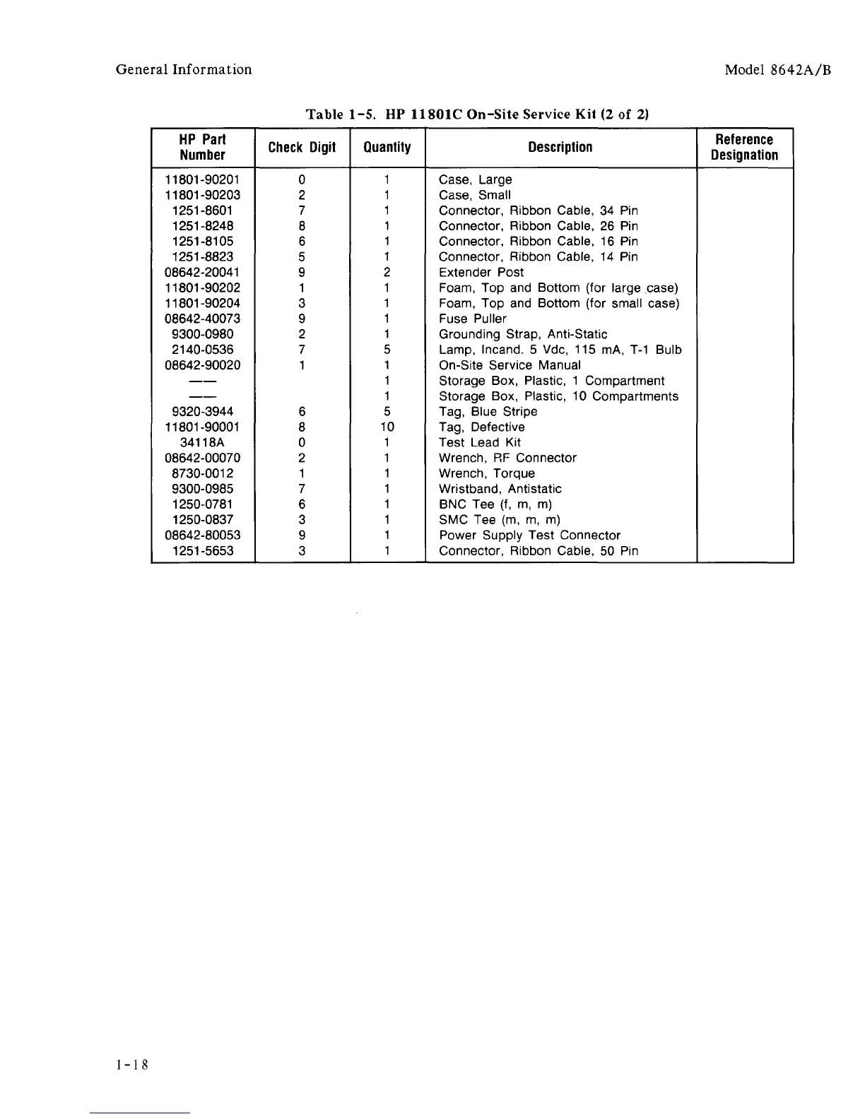 Table 1-5. HP 11801C On-Site Service Kit (2 of 2)