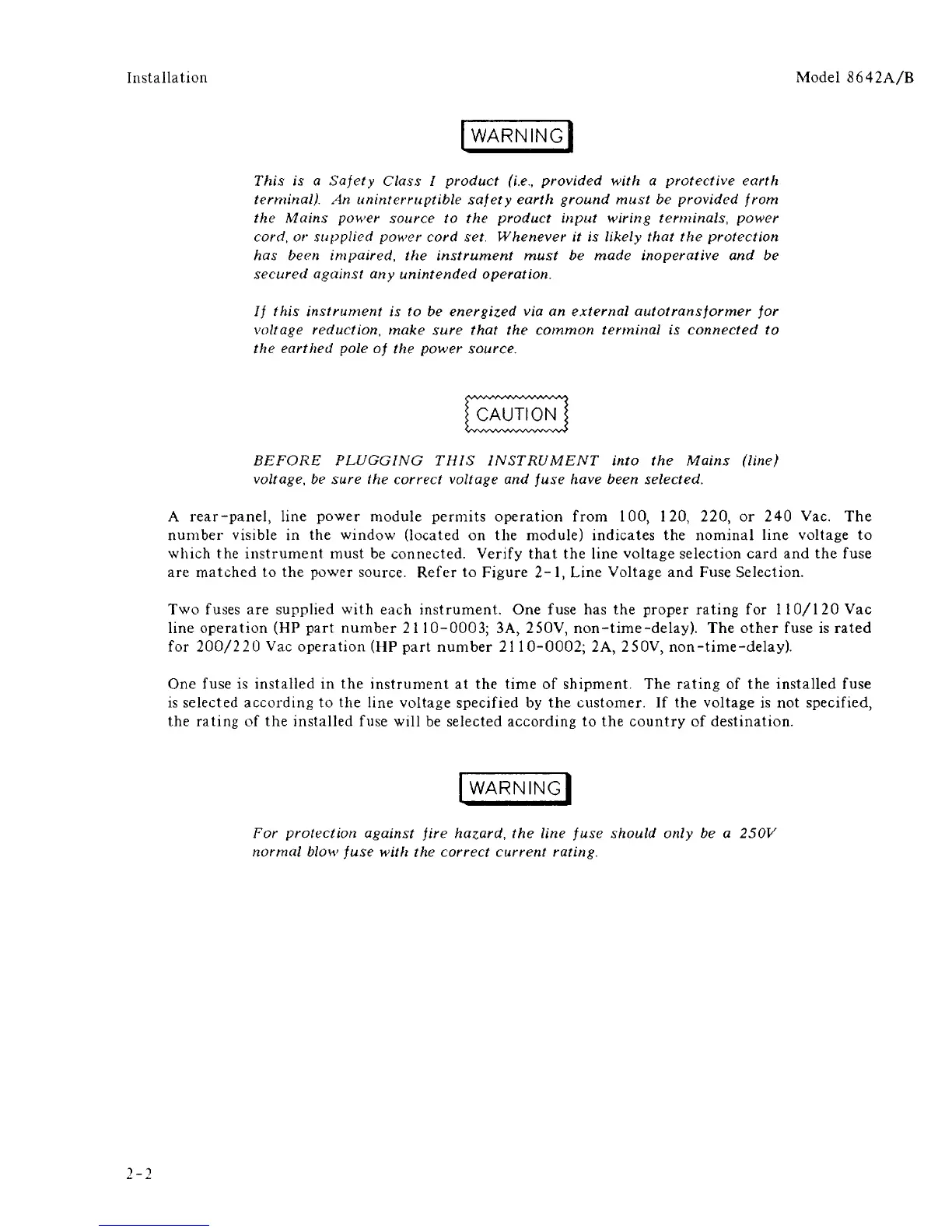 for 200/220 Vac operation (HP part number 21 10-0002; 2A, 250V, non-time-delay).