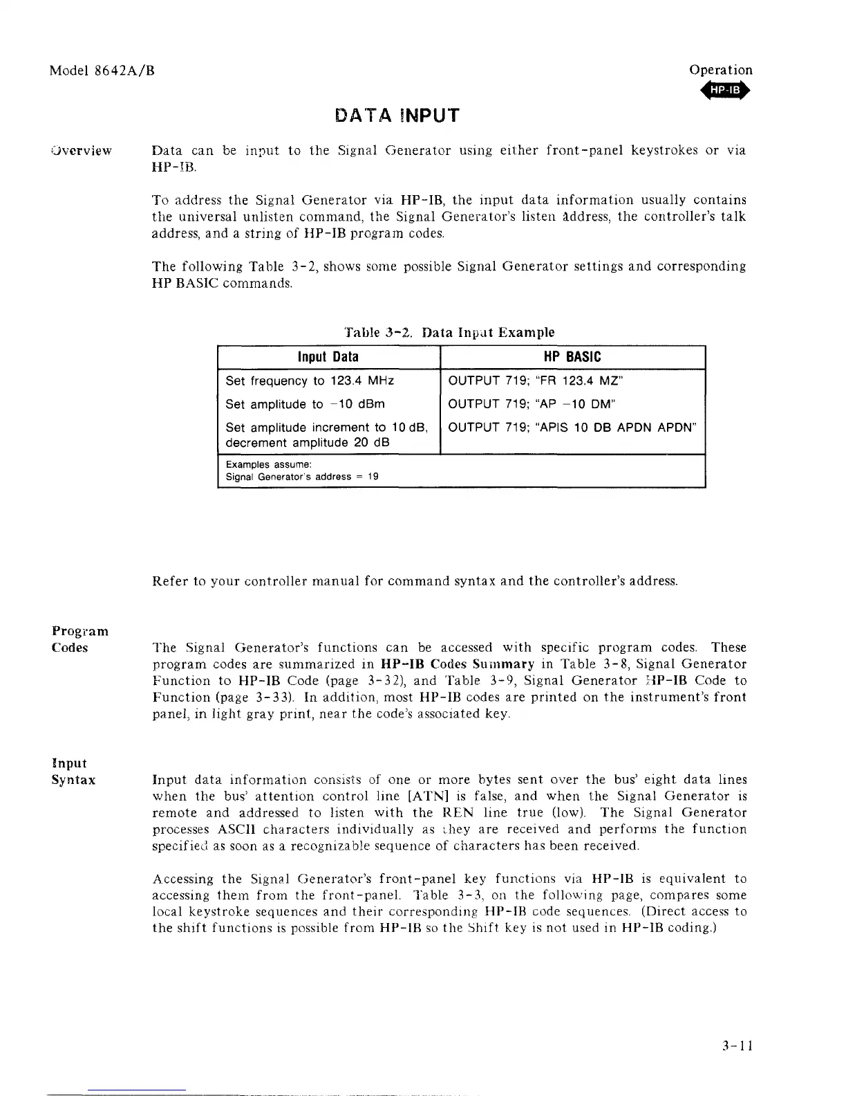 program codes are summarized in HP-IB Codes Summary in Table 3-8, Signal Generator