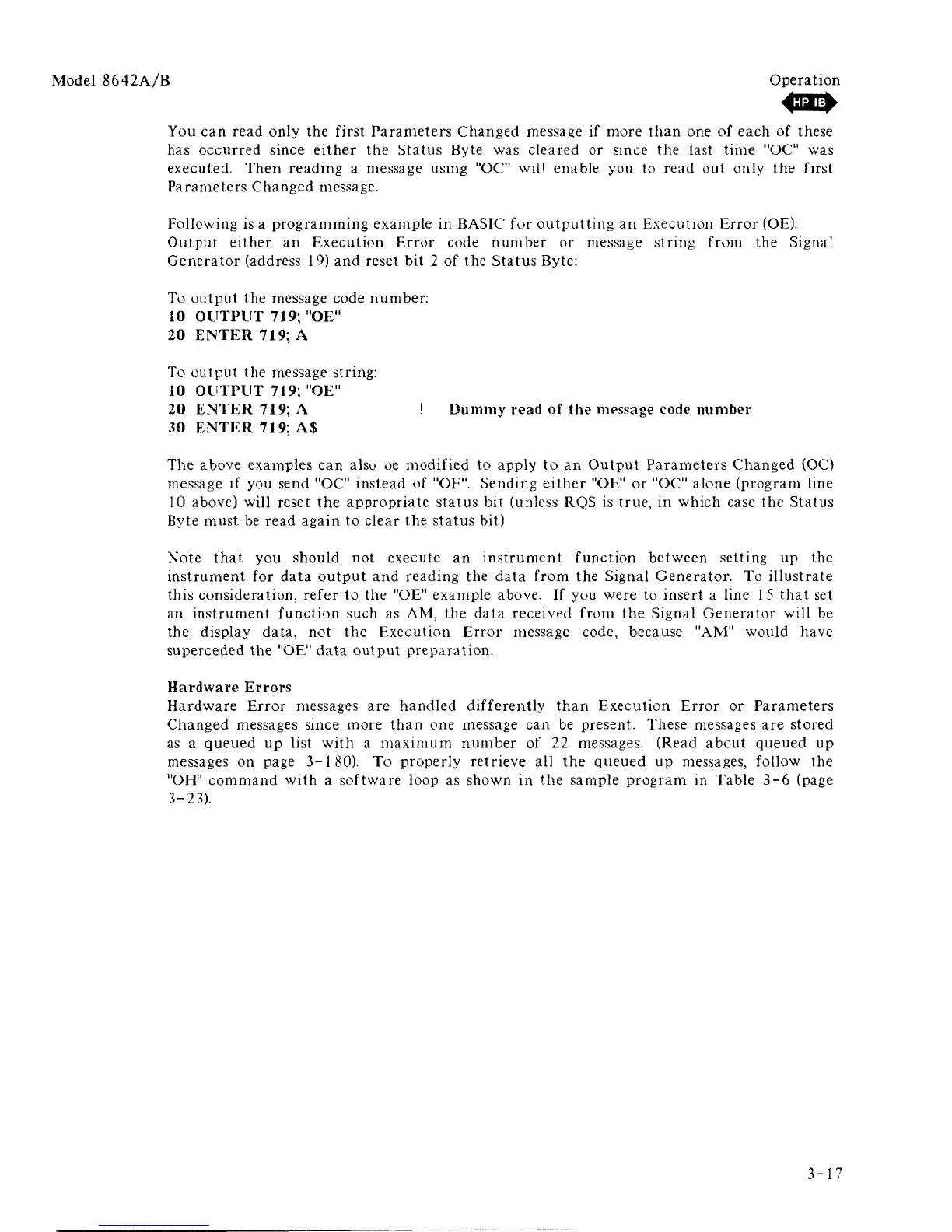 Following is a programming example in BASIC for outputting an Execution Error (OE):