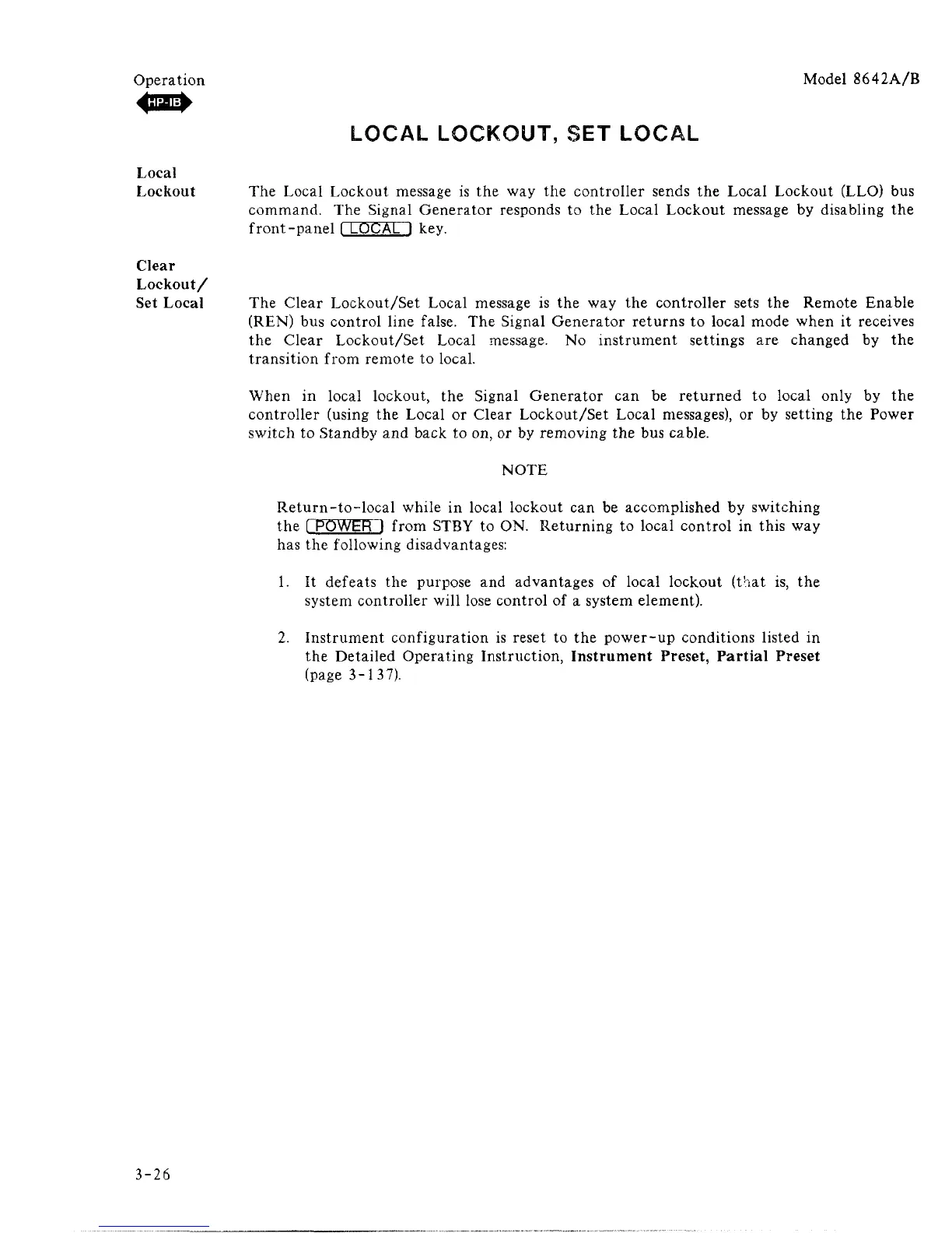 When in local lockout, the Signal Generator can be returned to local only by the