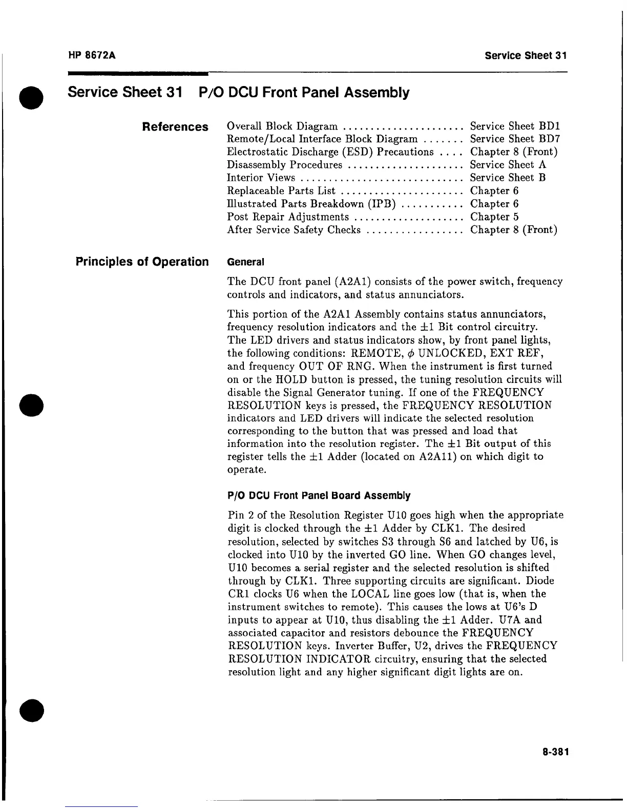 HP 8672a - Service Sheet 31 P;O DCU Front Panel Assembly; References; Principles of Operation