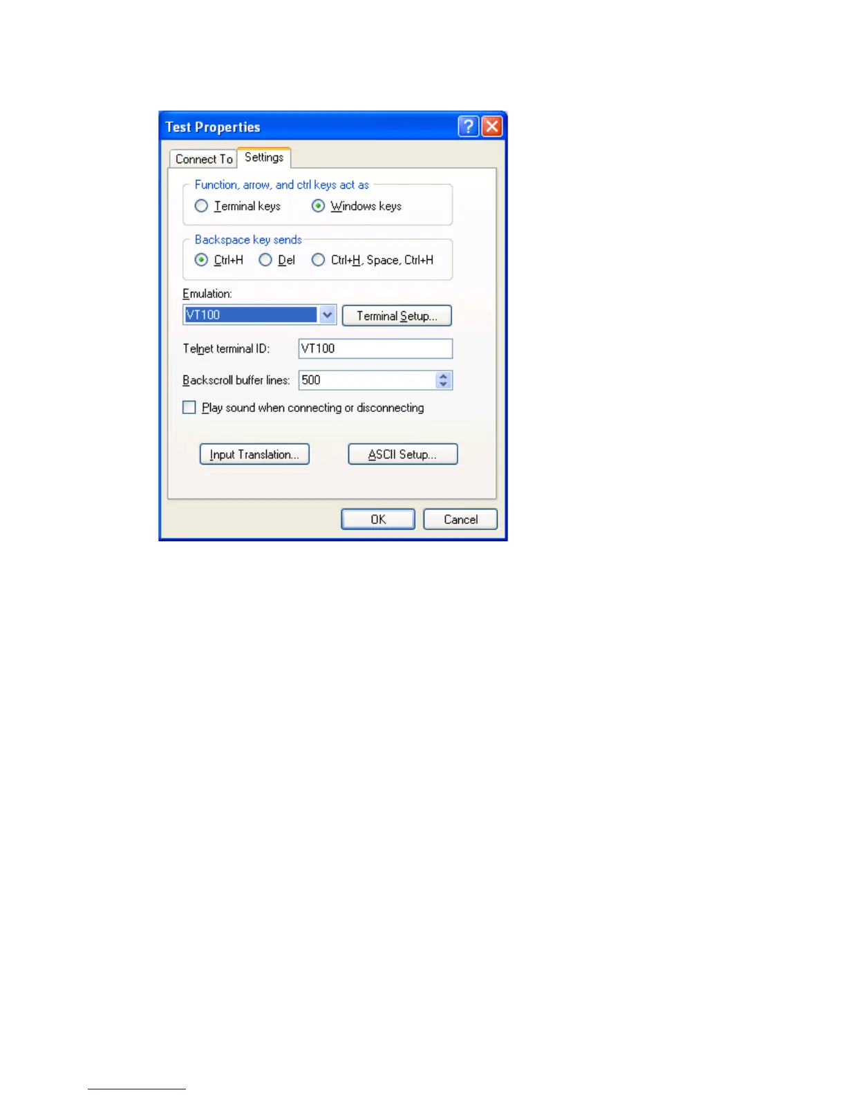 Figure 25 Setting the terminal emulation in Test Properties dialog box