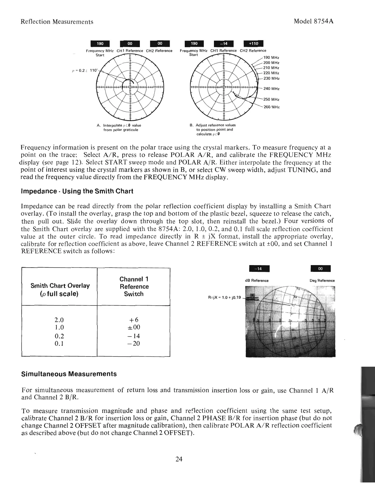 the Smith Chart overlay are supplied with the 8754A: 2.0, 1.0, 0.2, and 0.1 full scale reflection coefficient