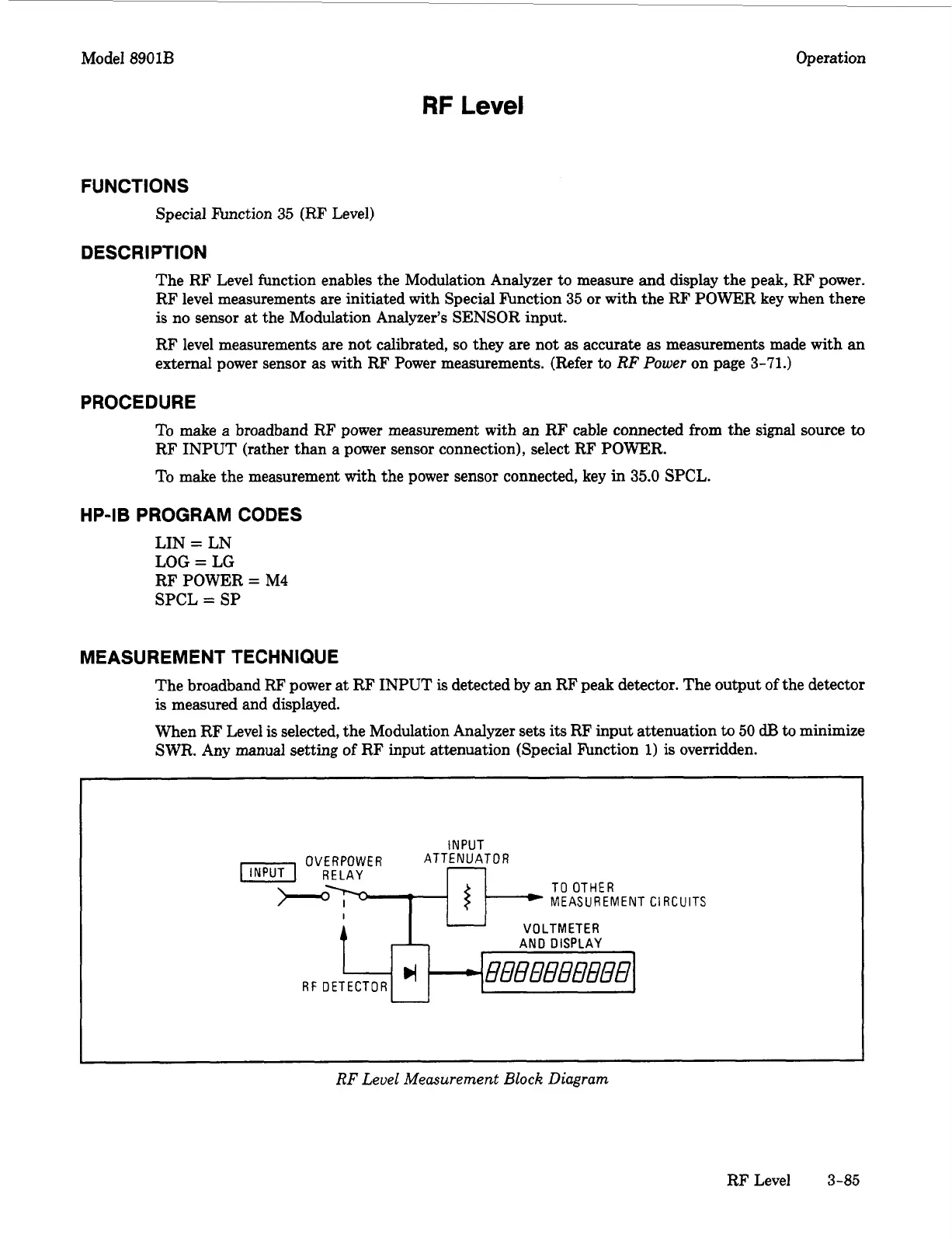 The RF Level function enables the Modulation Analyzer to measure and display the peak, RF power.