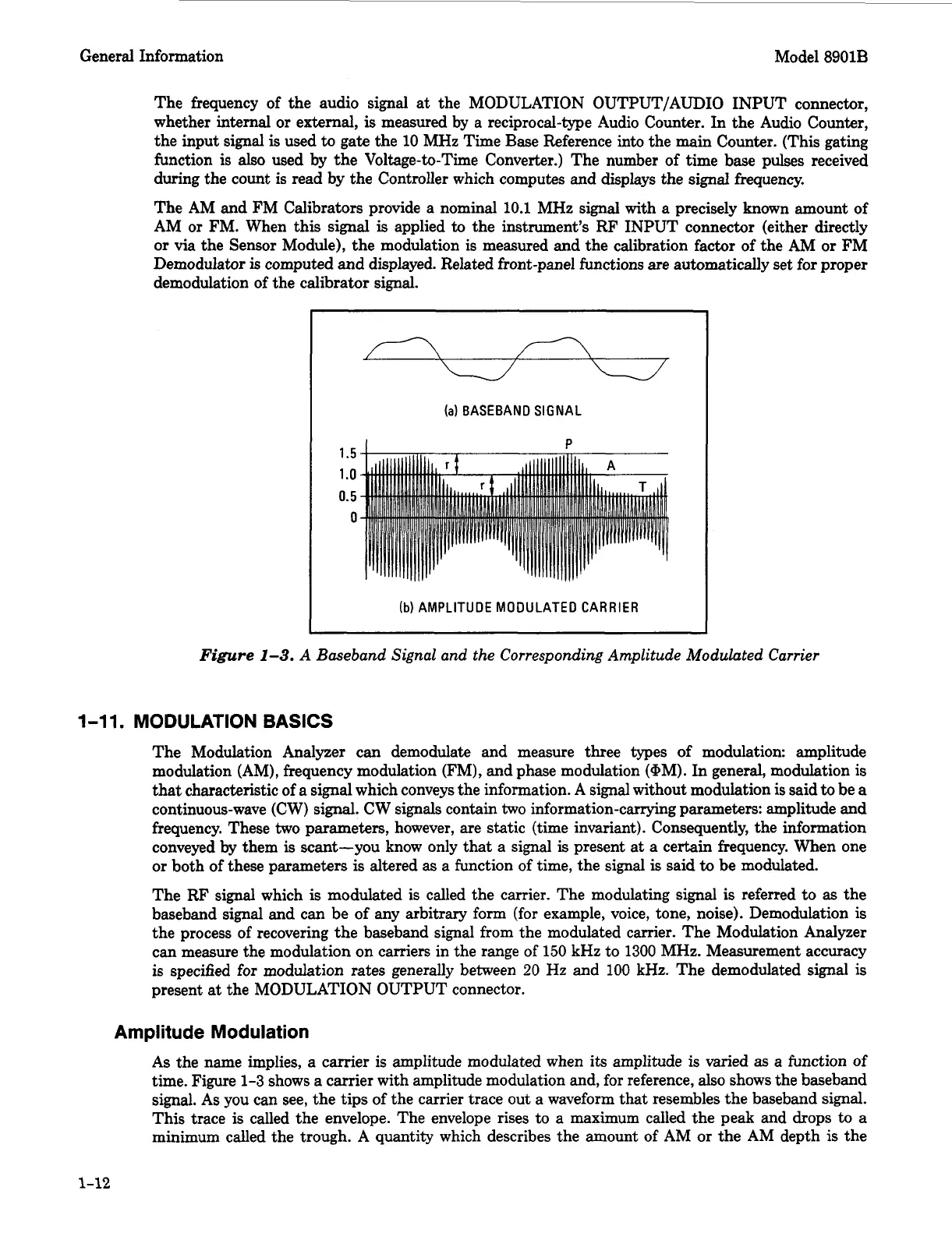 time. Figure 1-3 shows a carrier with amplitude modulation and, for reference, also shows the baseband