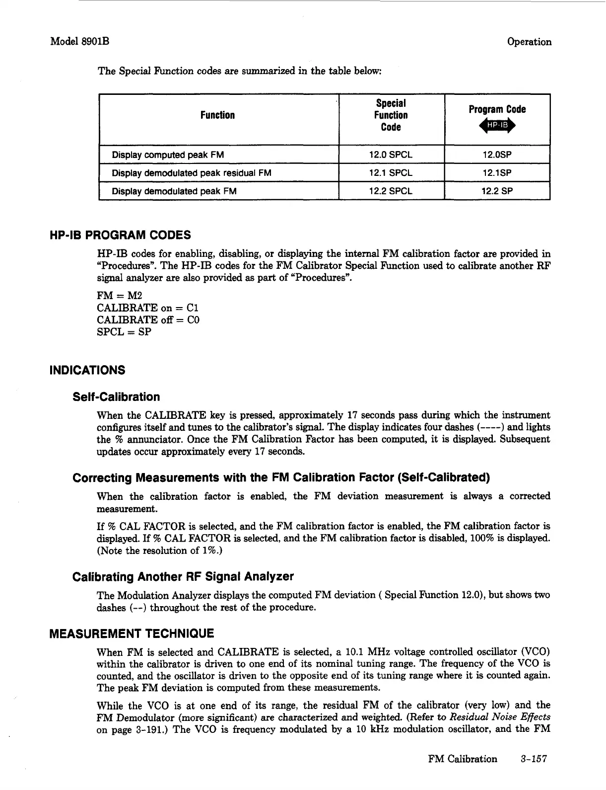 “Procedures”. The HP-IB codes for the FM Calibrator Special Function used