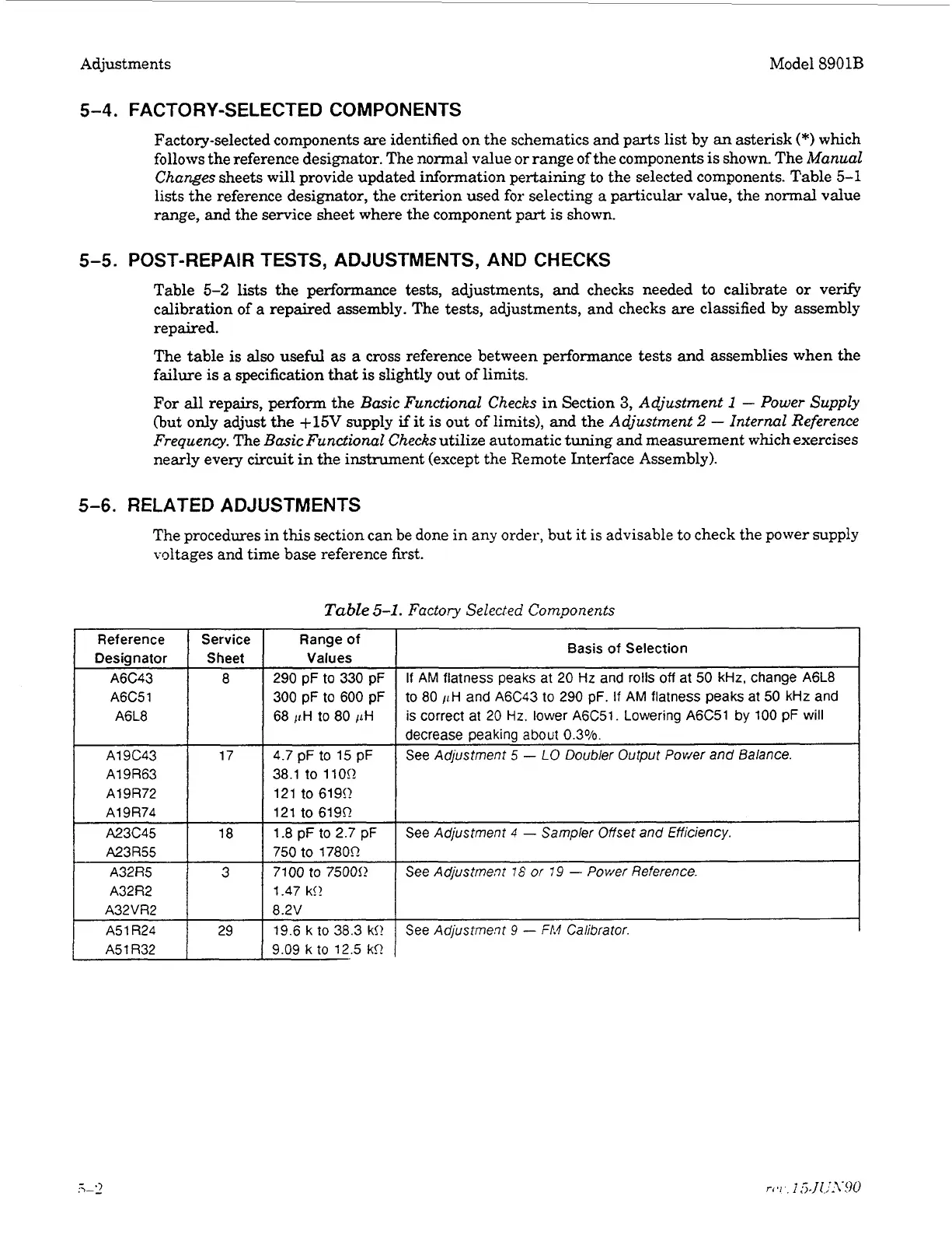 calibration of a repaired assembly. The tests, adjustments, and checks are classified by assembly