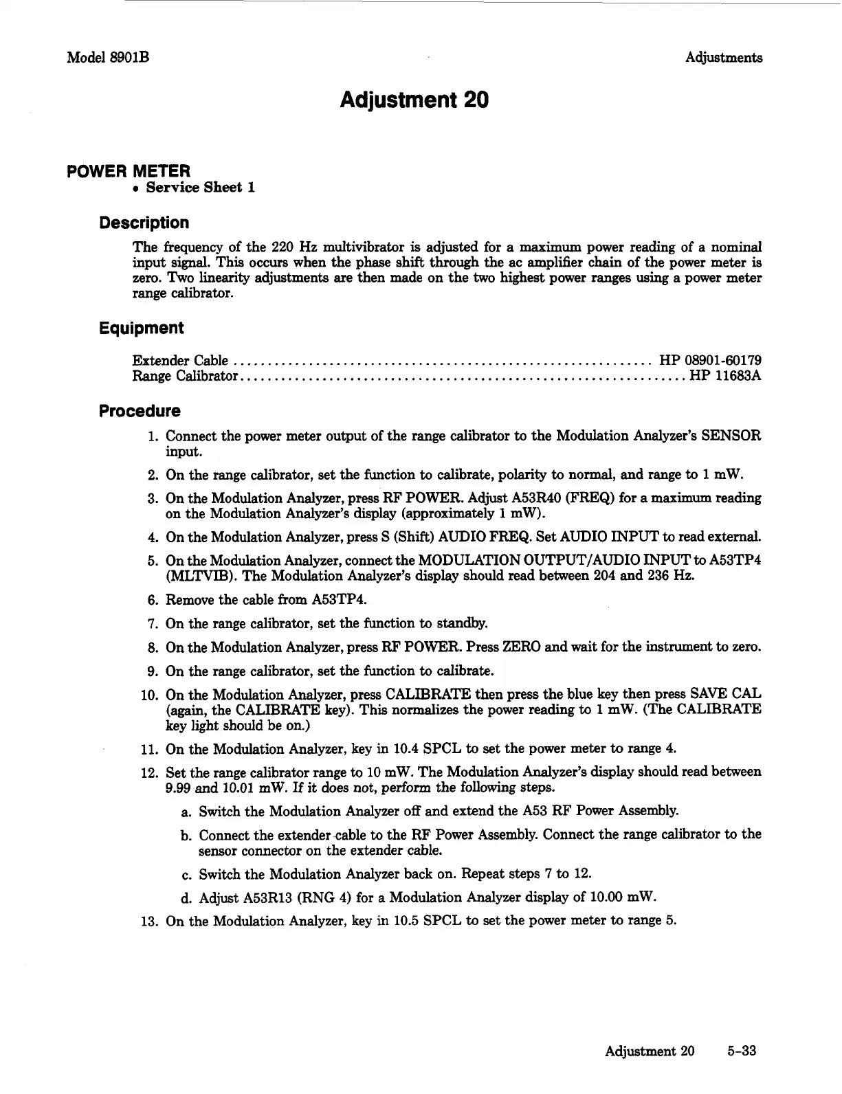 d. Adjust A53R13 (RNG 4) for a Modulation Analyzer display of 10.00 mW.