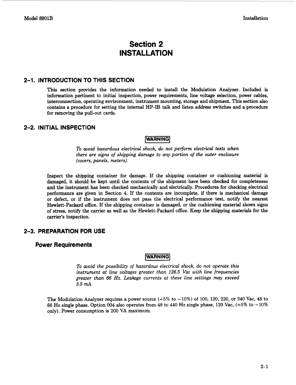 information pertinent to initial inspection, power requirements, line voltage selection, power cables,
