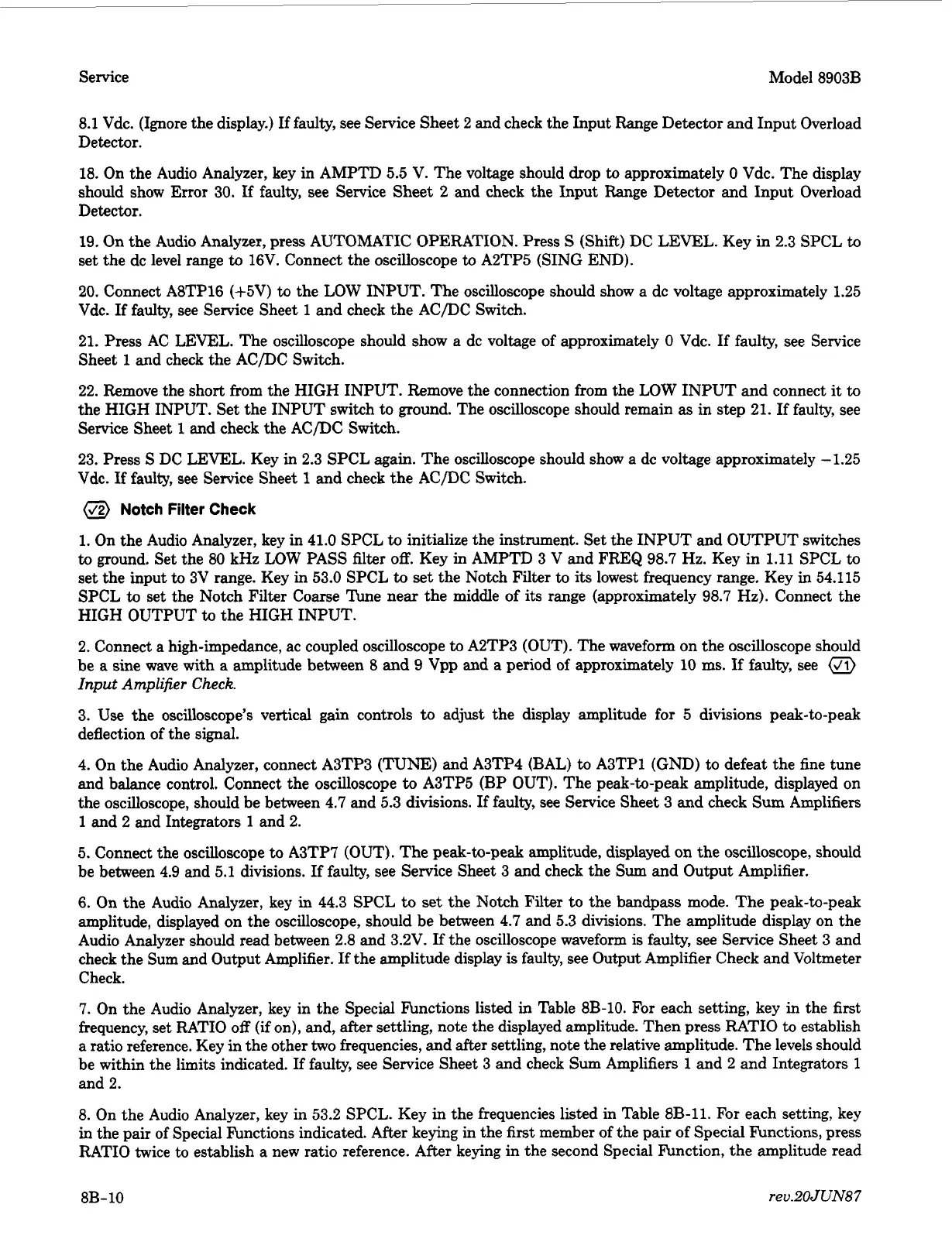 On the Audio Analyzer, key in the Special hnctions listed in Table 8B-10. For each setting, key