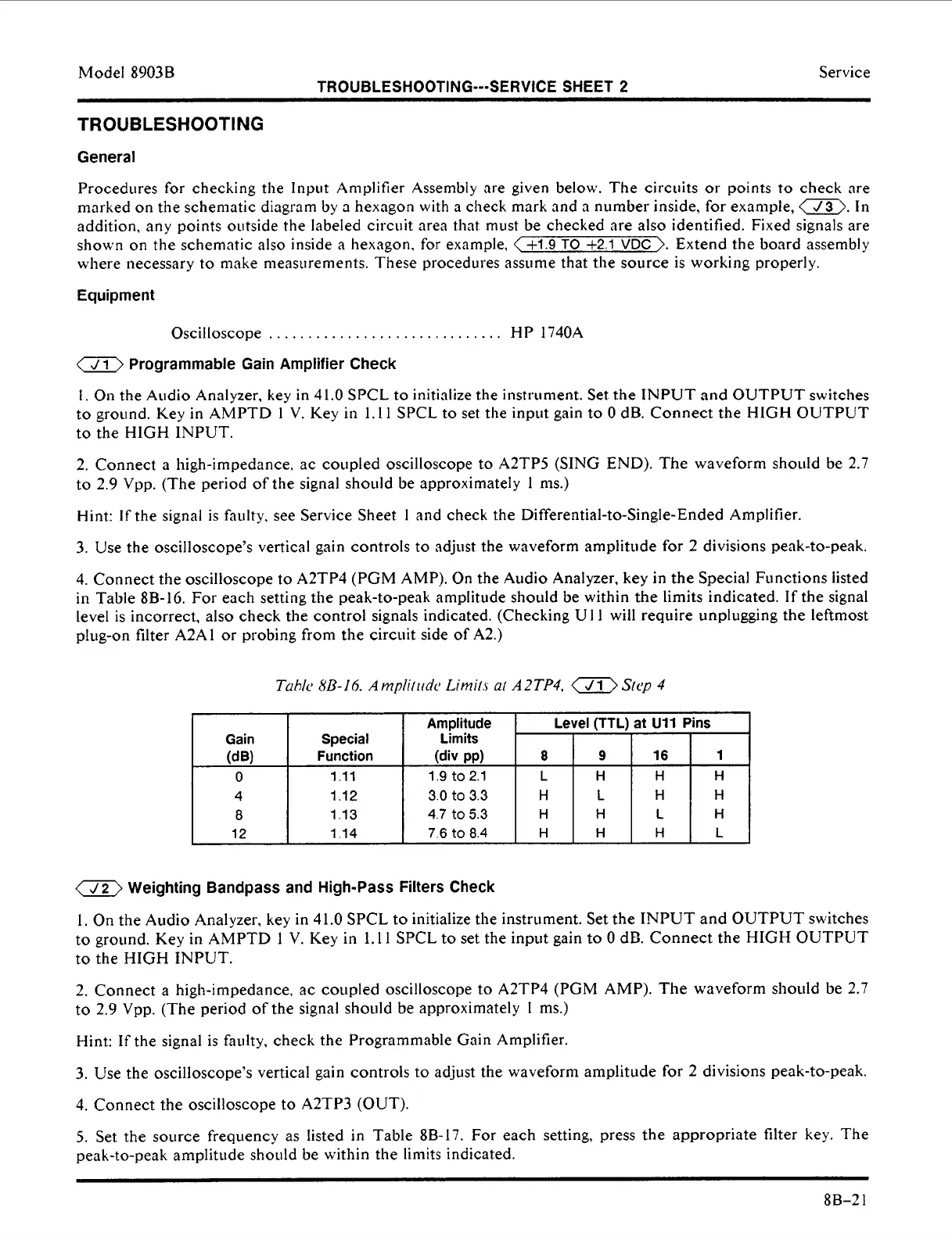 in Table 8B-16. For each setting the peak-to-peak amplitude should be within the limits indicated. If the signal