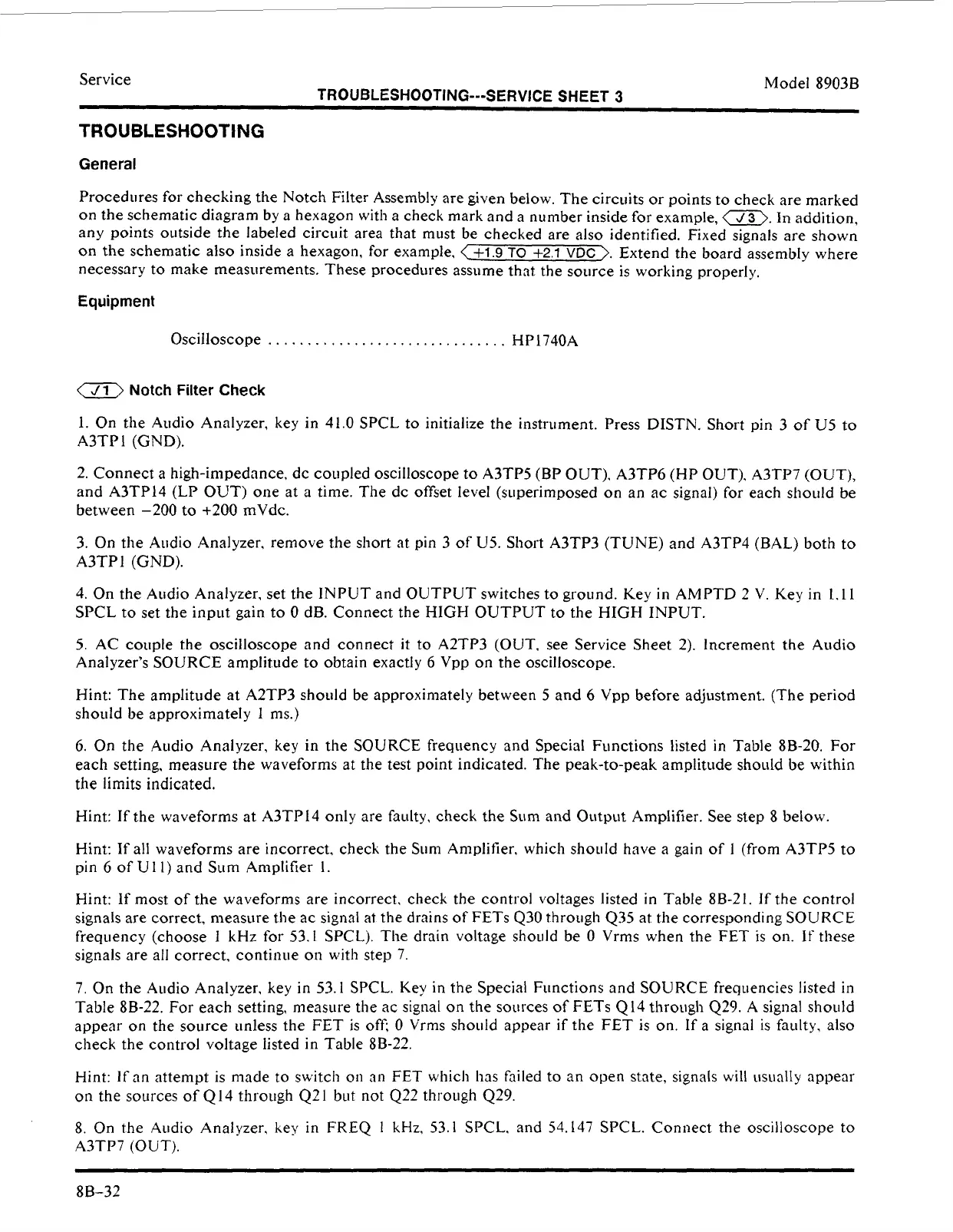 6. On the Audio Analyzer, key in the SOURCE frequency and Special Functions listed in Table 8B-20. For