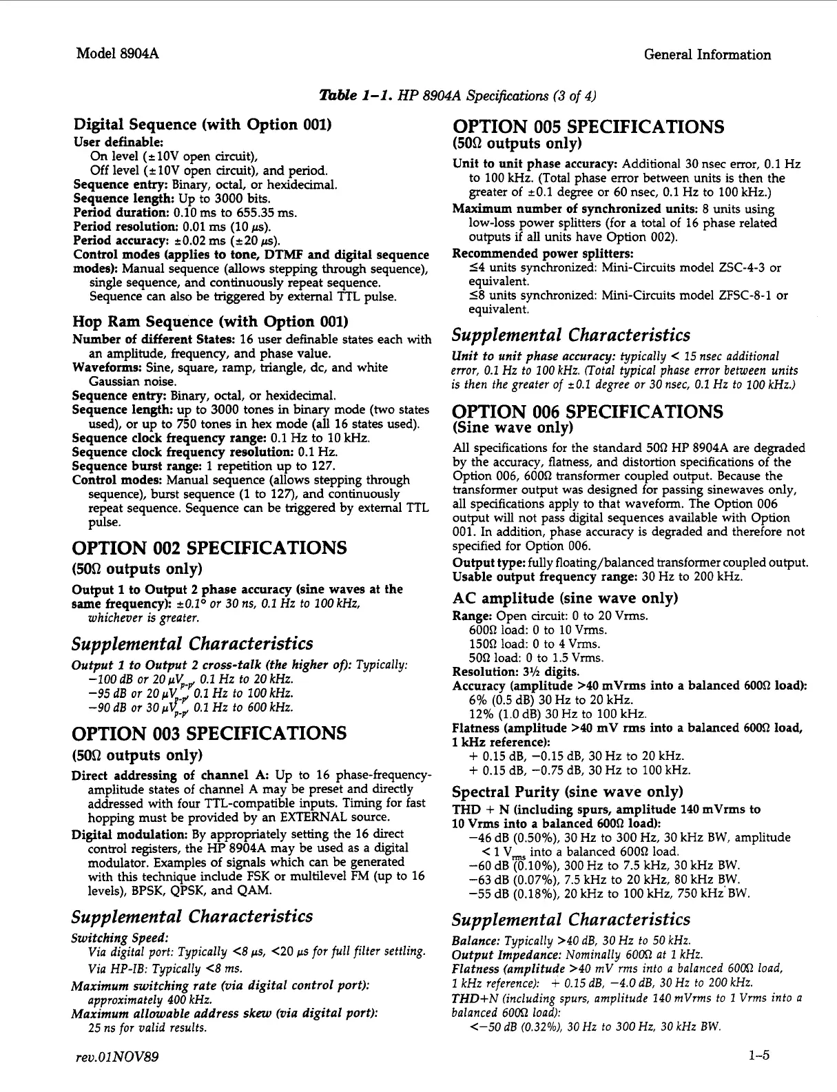 All specifications for the standard 50Q HP 8904A are degraded