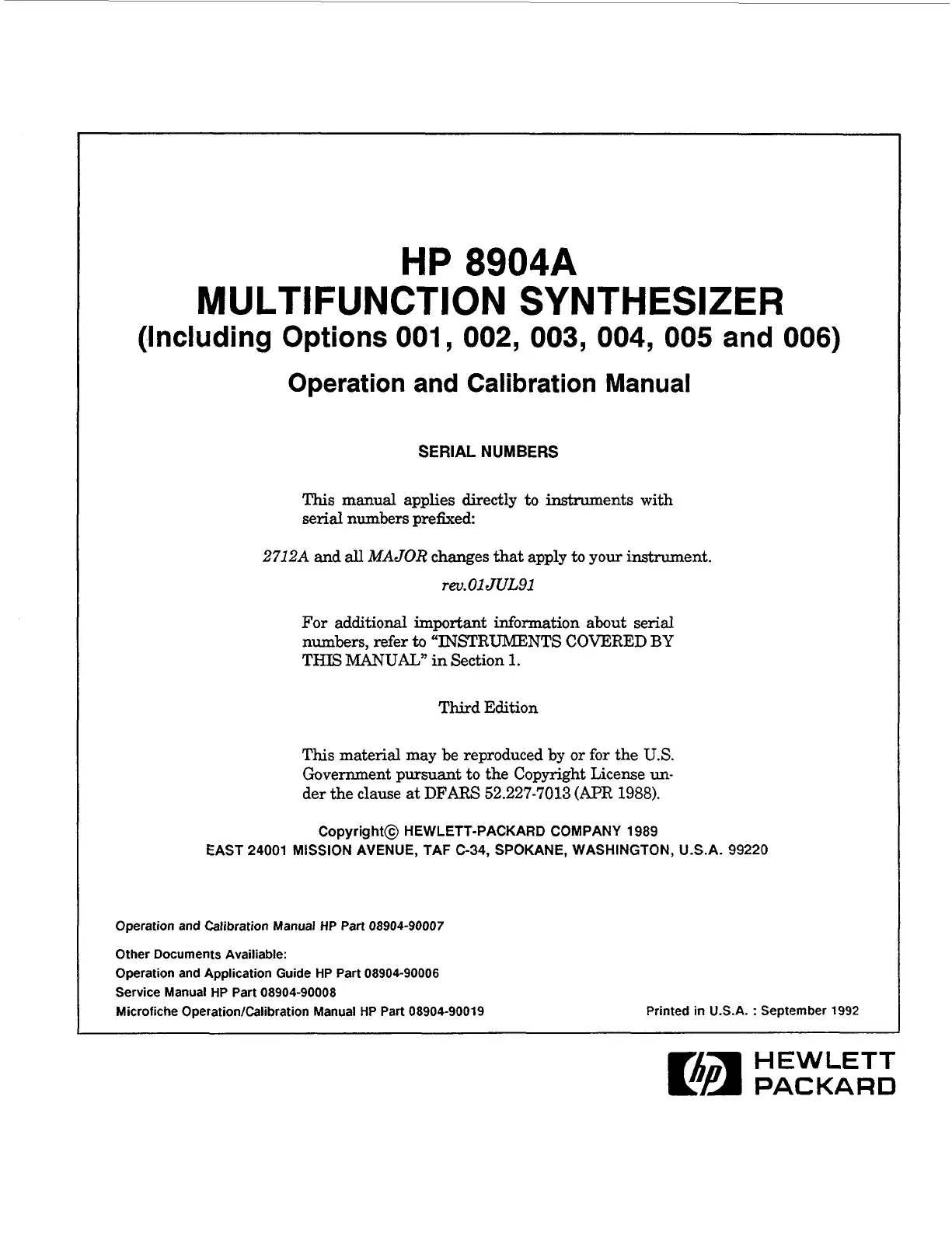 Operation and Calibration Manual HP Part 08904-90007