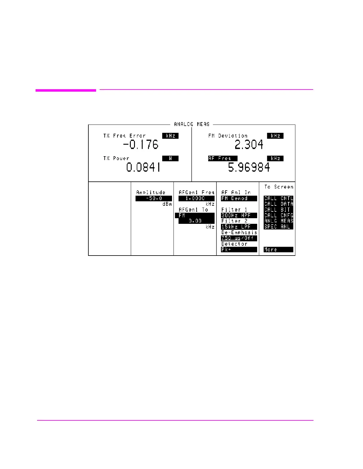 The ANALOG MEAS screen is used to make RF and audio measurements on the