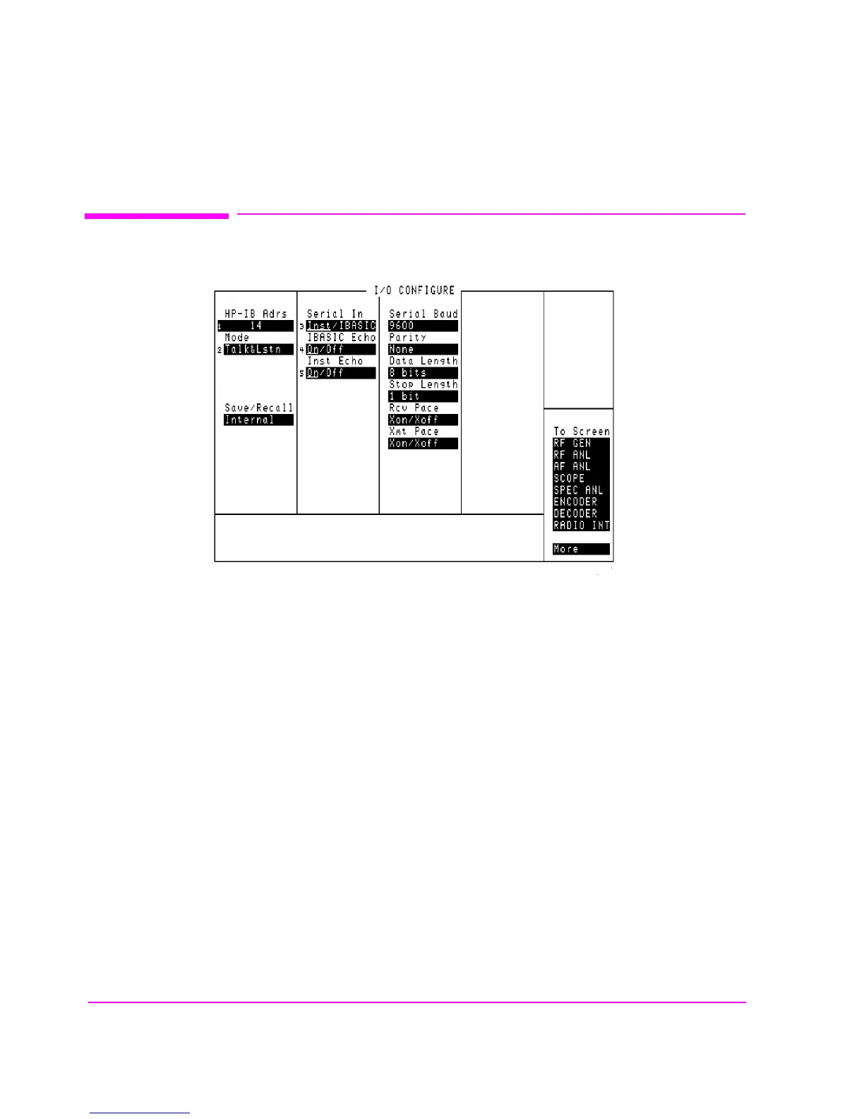 The I/O CONFIGURE screen’s fields are used to specify HP-IB and serial