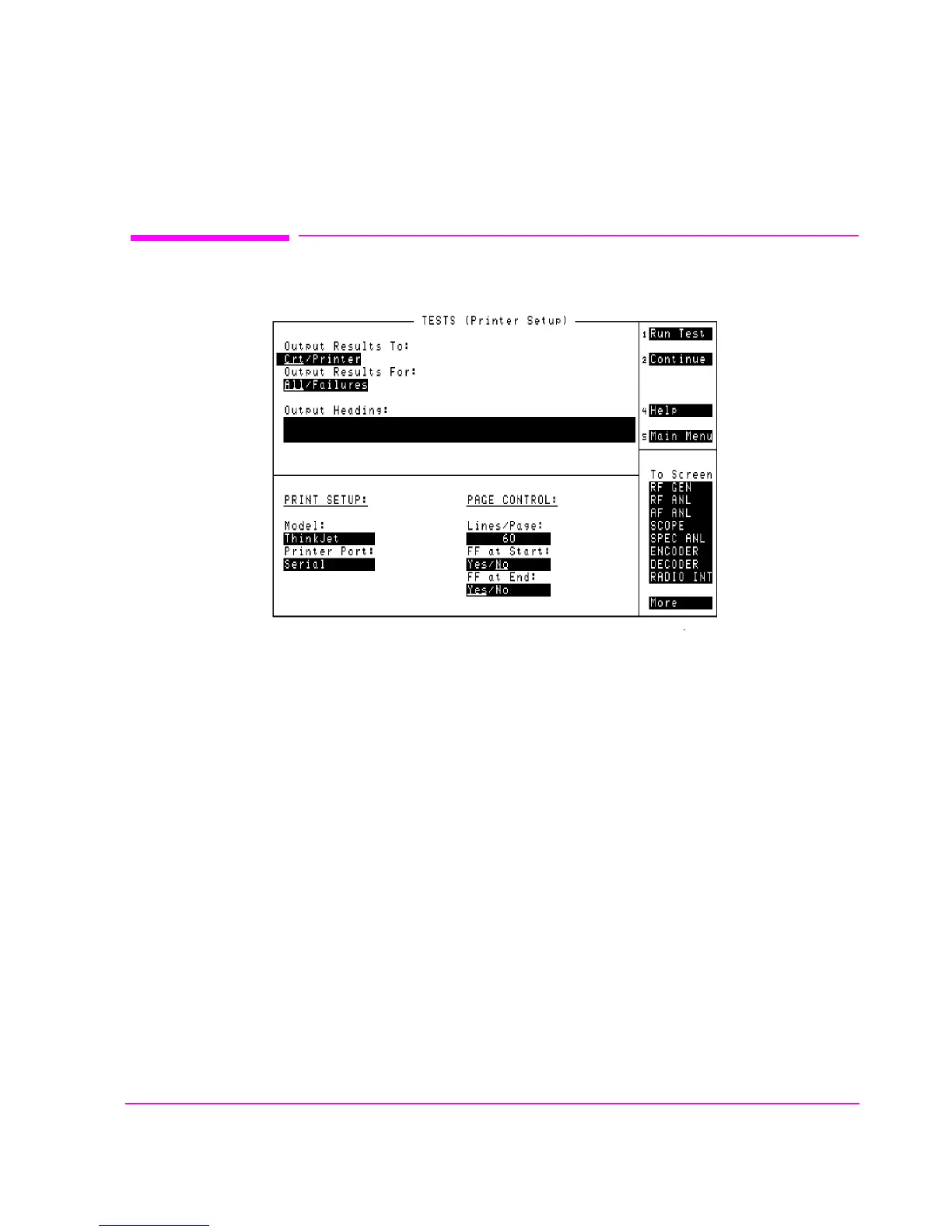 Figure 112 The TESTS (Printer Setup) Screen