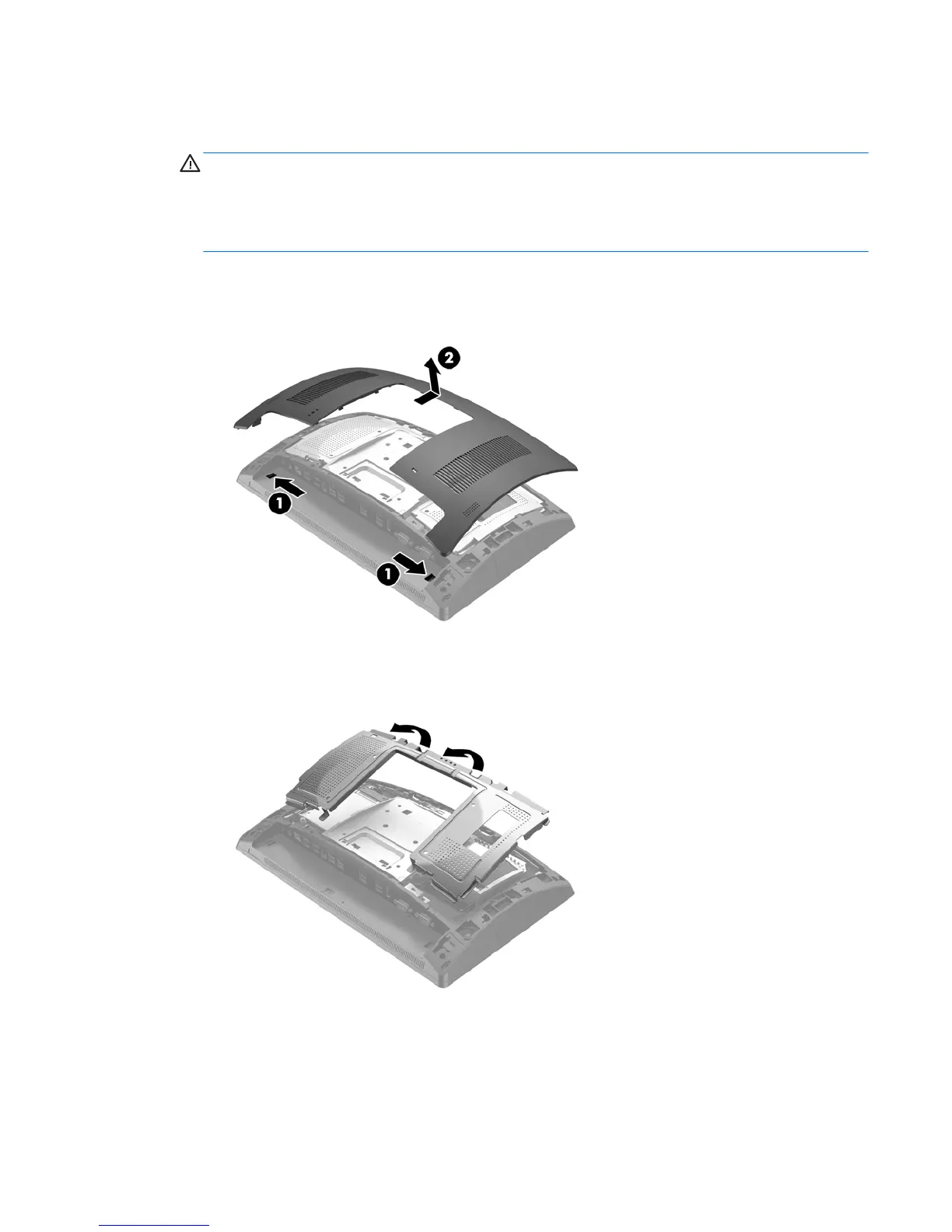 4. Press the two rear cover latches outward (1). Slide the rear cover up, and then lift it o the display head