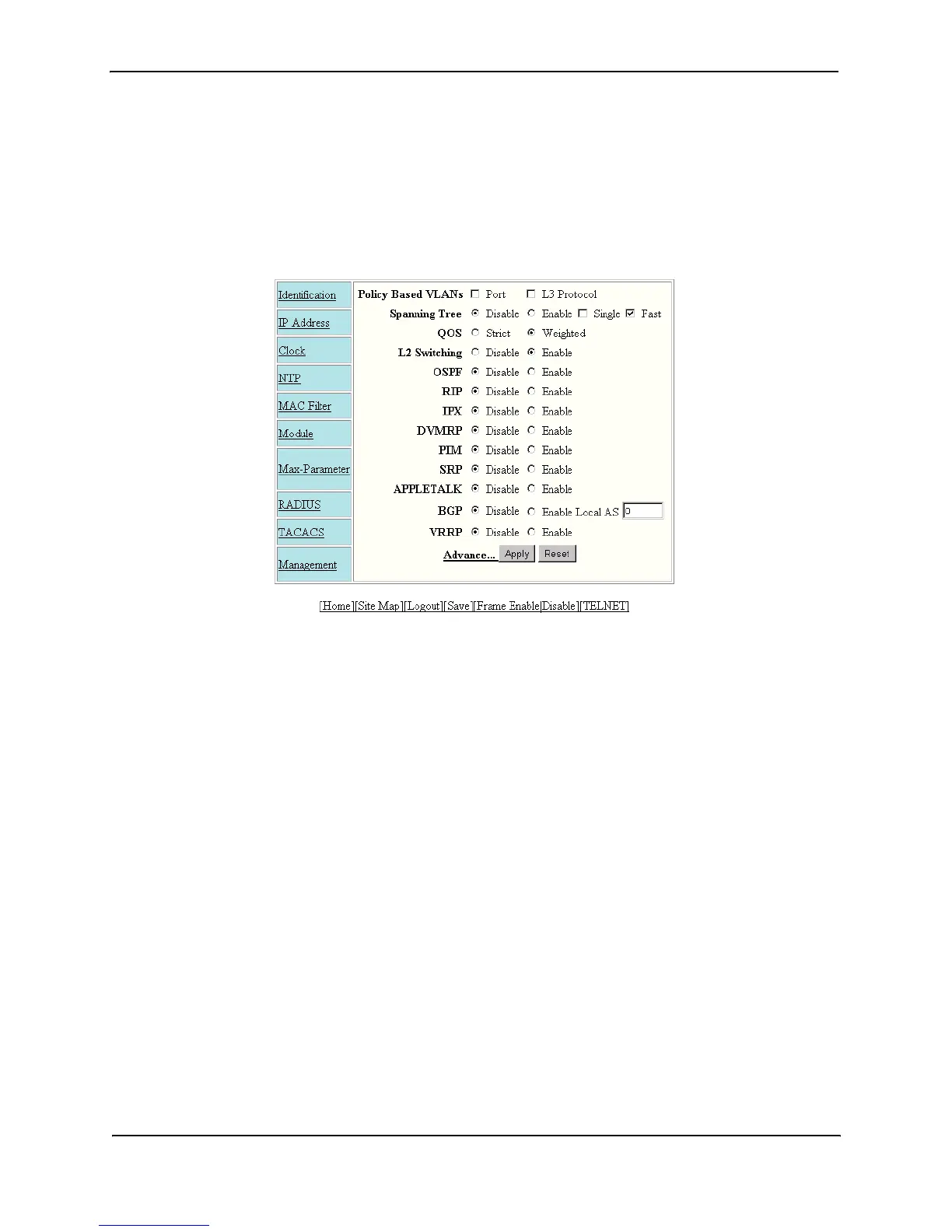 • Enable or disable protocol—OSPF, RIP, IPX, DVMRP, PIM, SRP, VRRP, BGP4, AppleTalk.