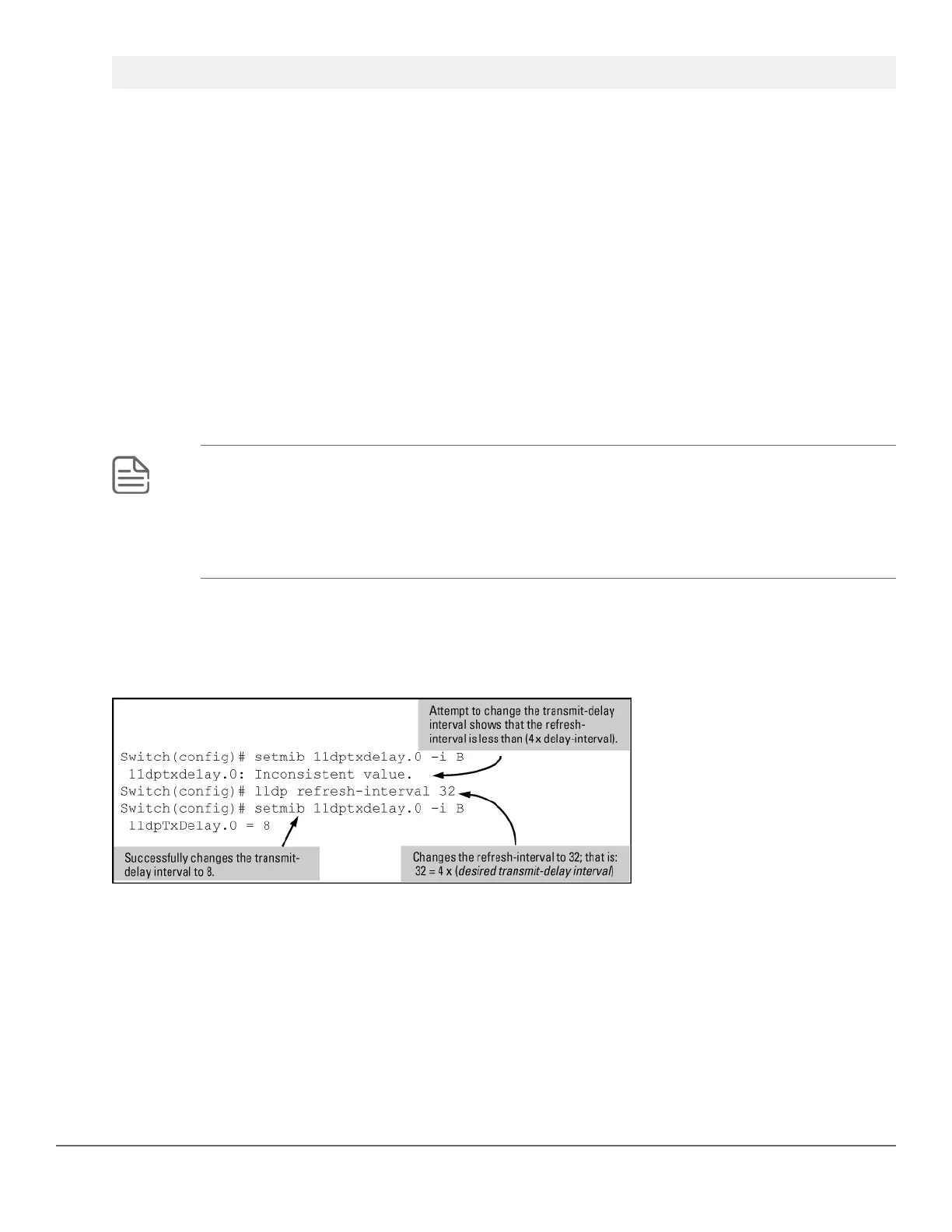 NOTE: The LLDP refresh-interval (transmit interval) must be greater than or equal to (4 x delay-