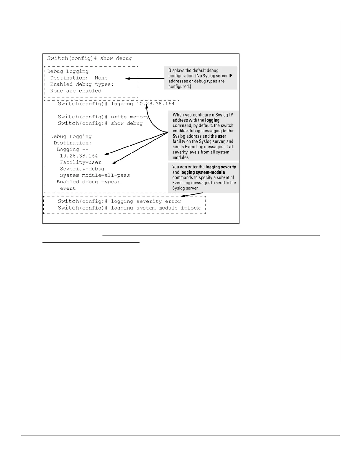 system module and severity levels on page 516, if you enter the show debug command when no syslog