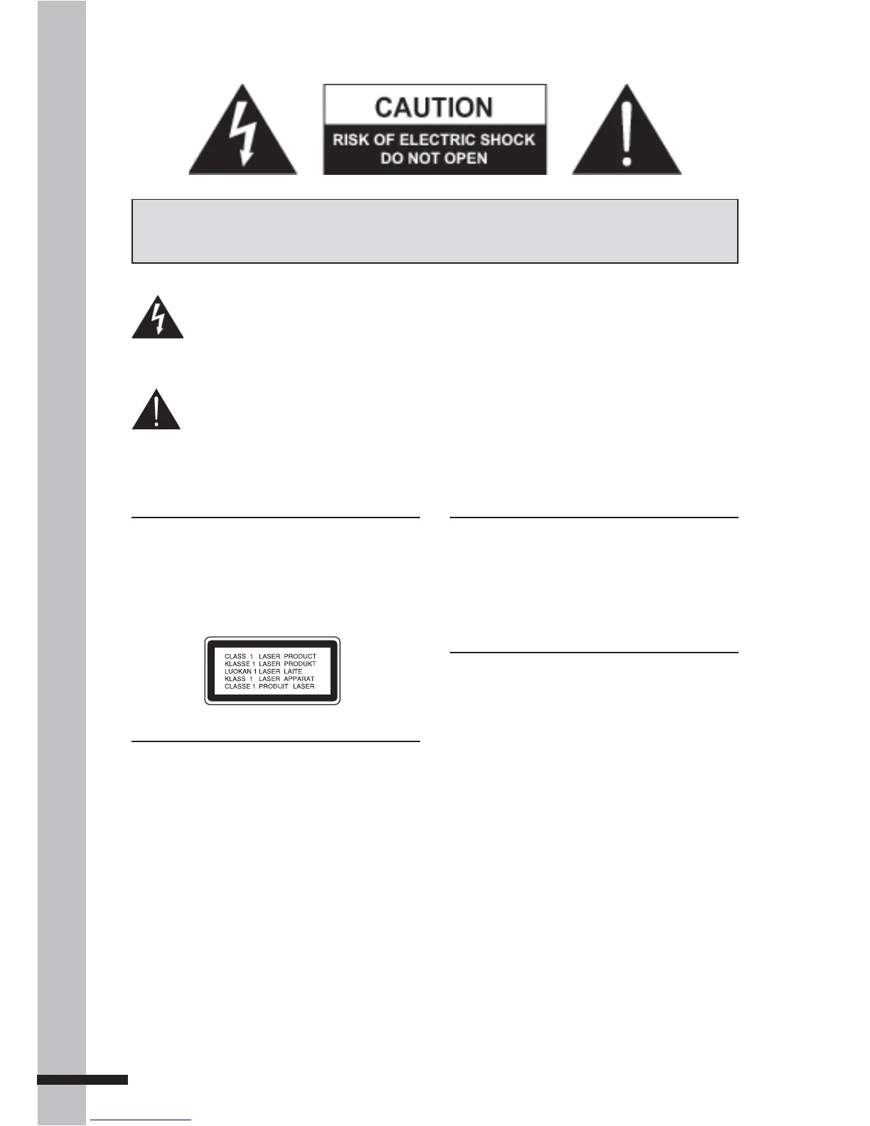 CAUTION: TO REDUCE THE RISK OF ELECTRIC SHOCK, DO NOT REMOVE THE COVER (OR BACK). NO