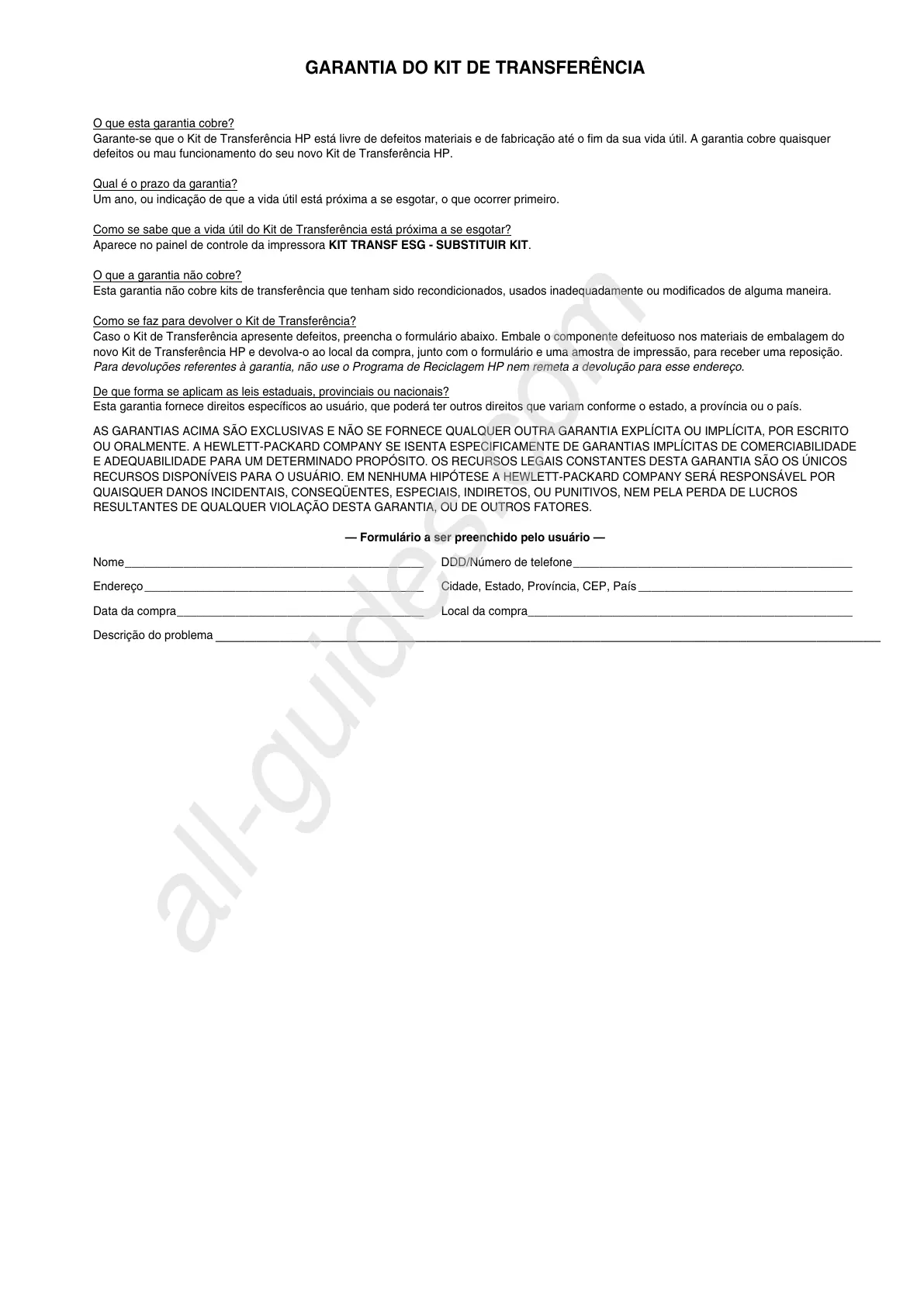 Garante-se que o Kit de Transferência HP está livre de defeitos materiais e de fabricação até o fim da sua vida útil. A garantia cobre quaisquer