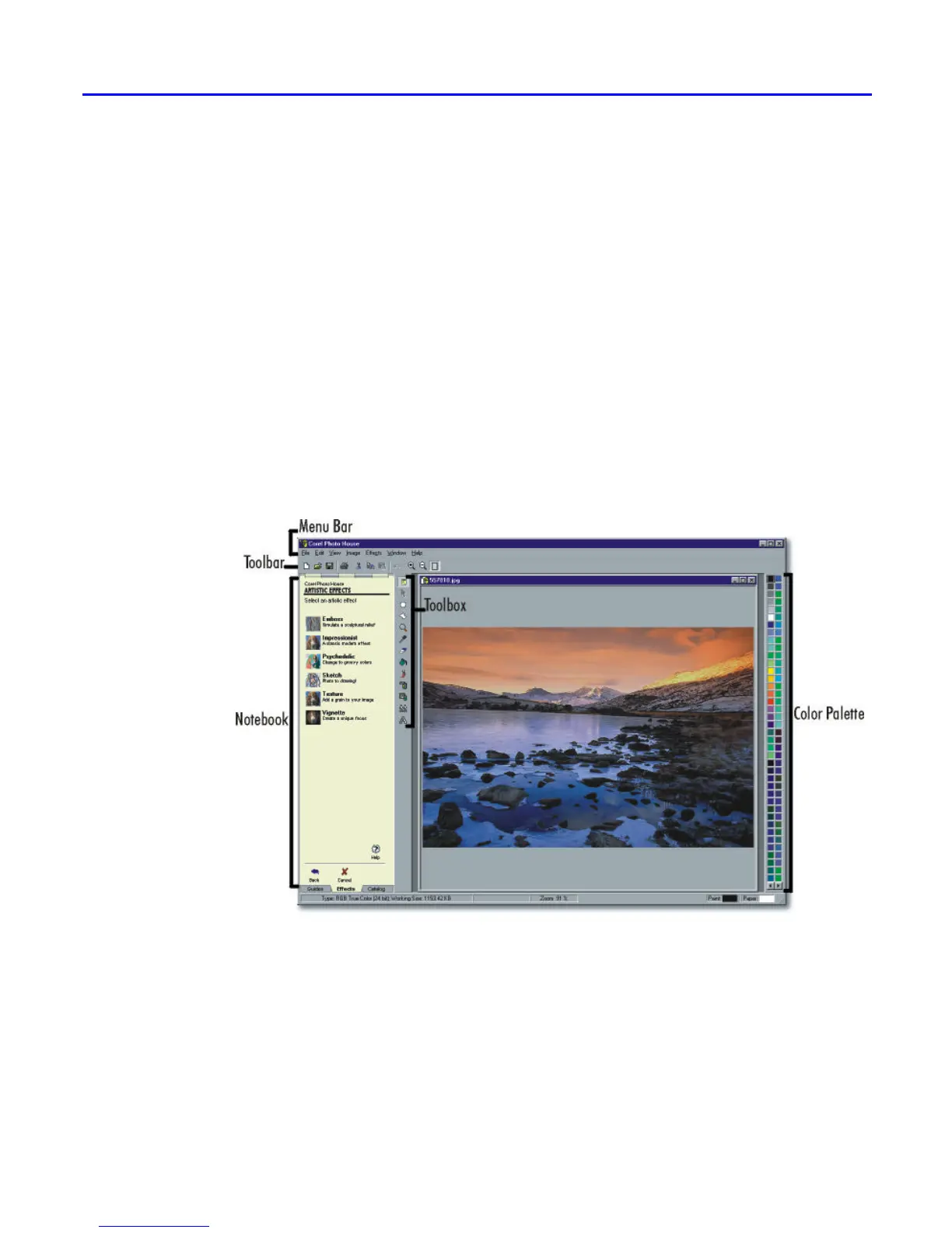 and toolbar shown above. To hide them, click View, Color Palette or