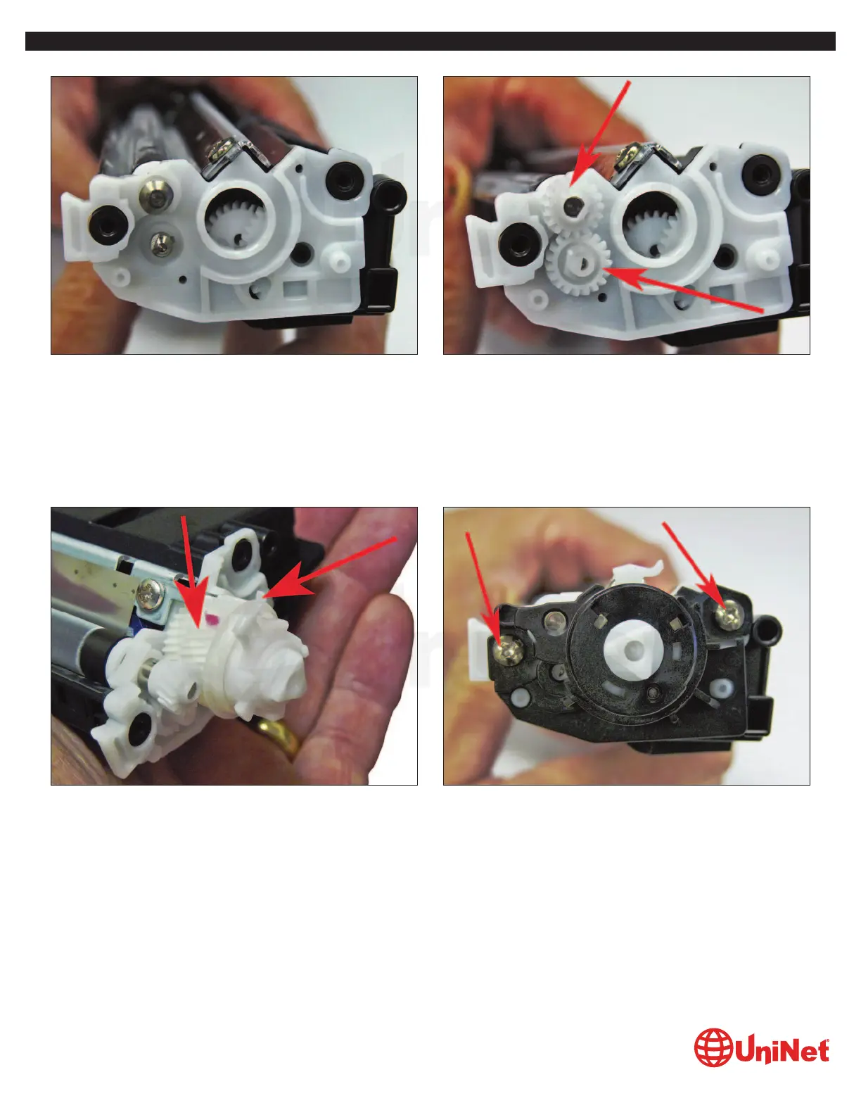 23. Press the inner end cap in place. 24. Install the two gears on the feed and developer roller shafts.