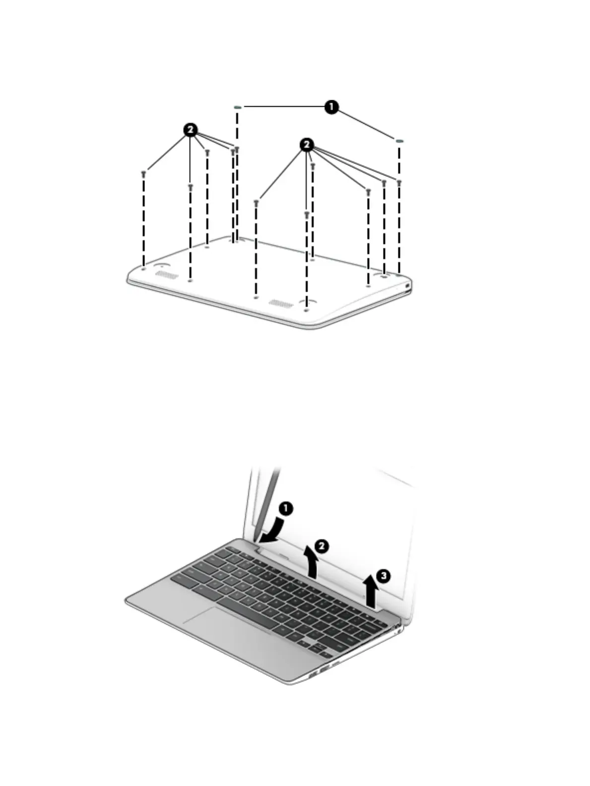 5. Use a prying tool to disengage the top cover and base plastic. Start from the rear (1) of the keyboard/top
