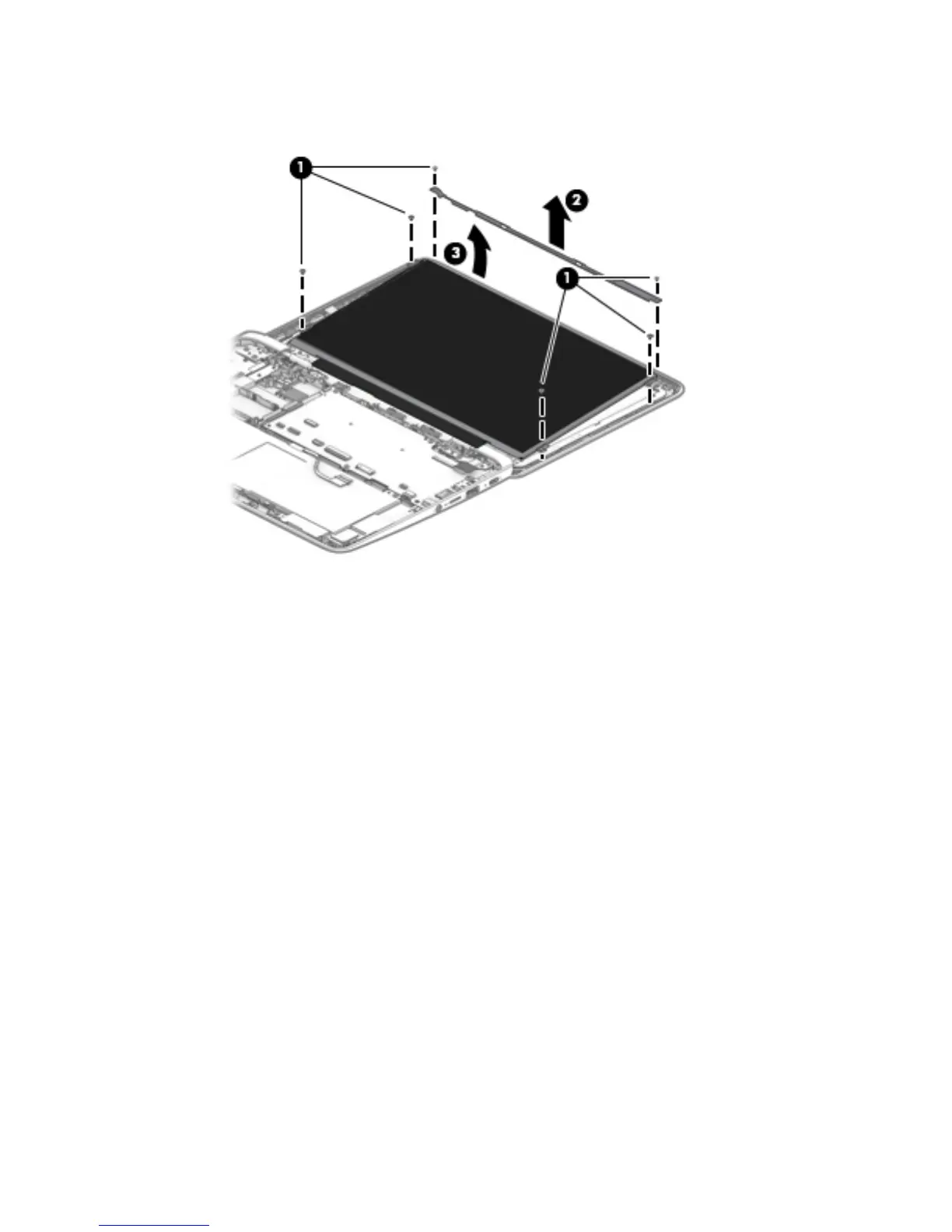 d. Lift the top edge of the display panel (3) and swing it up and forward until it rests upside down on
