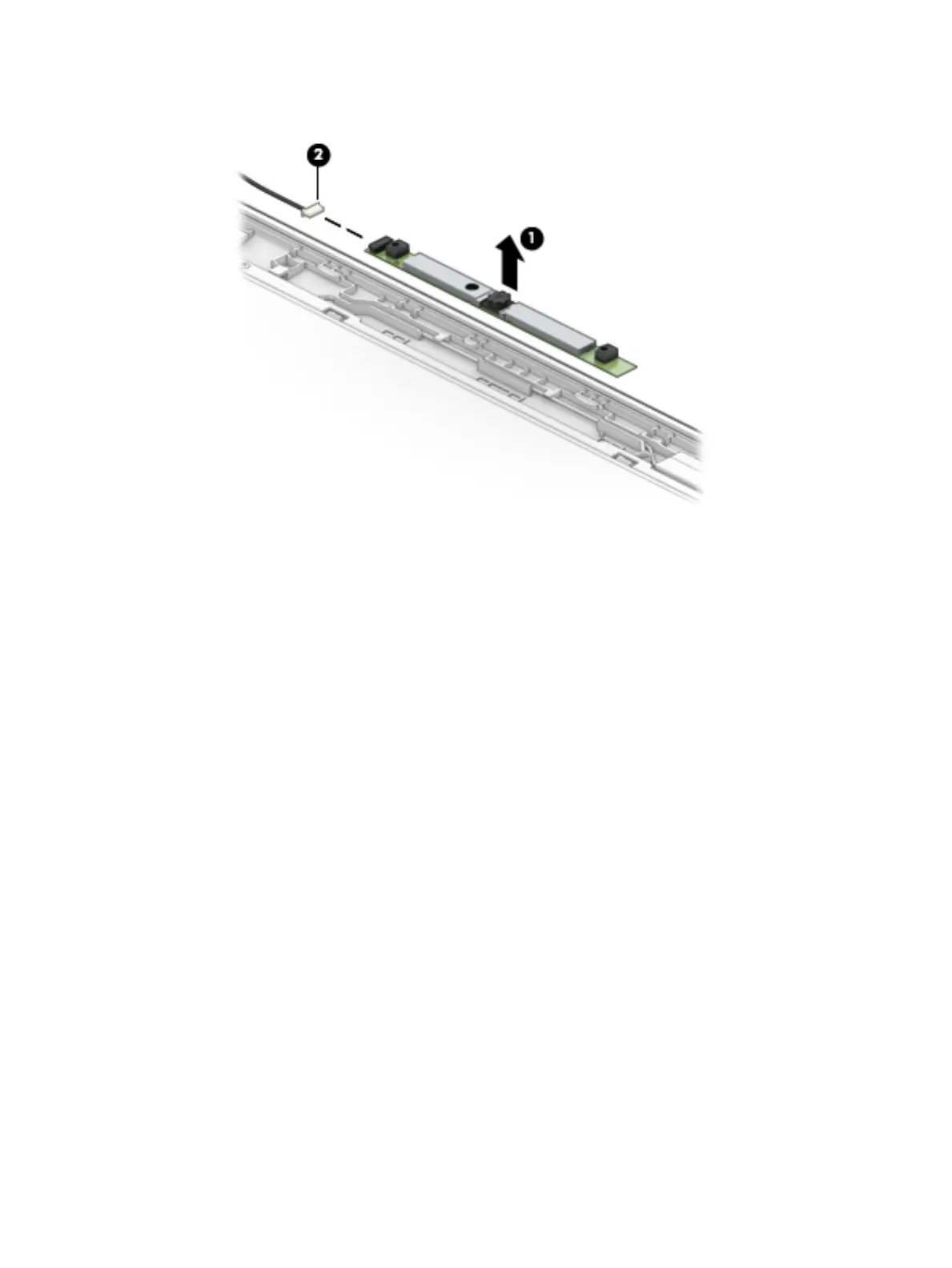 c. Disconnect the webcam/microphone module cable (2) from the webcam/microphone module.