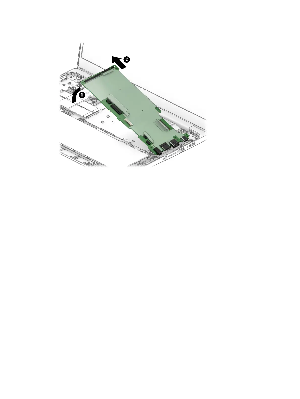 12. Remove the system board (2) by sliding it up and to the left at an angle.