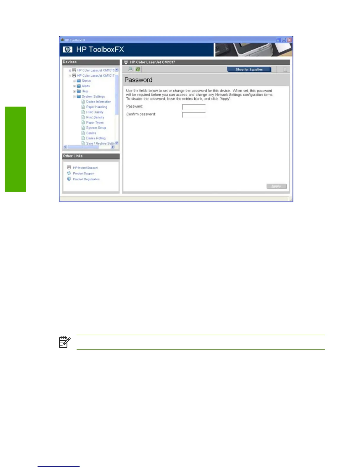 The following HP ToolboxFX features become locked when a password is set.