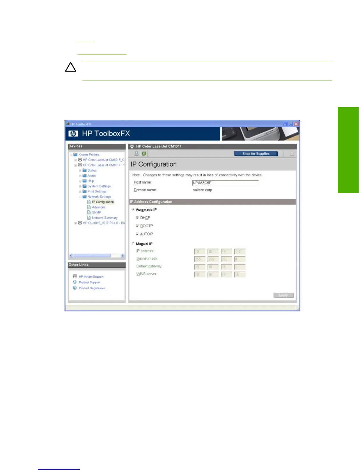 By default, the HP Color LaserJet CM1017 MFP uses automatic IP configuration and DNS Server. Use
