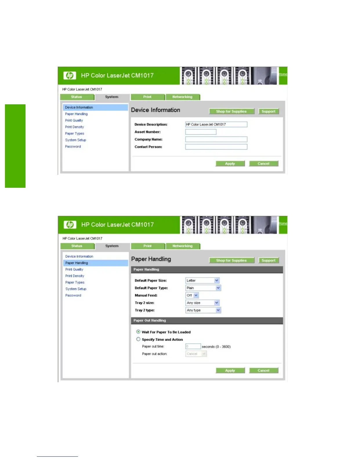 Use this page to configure the paper-handling settings for the HP Color LaserJet CM1017 MFP.