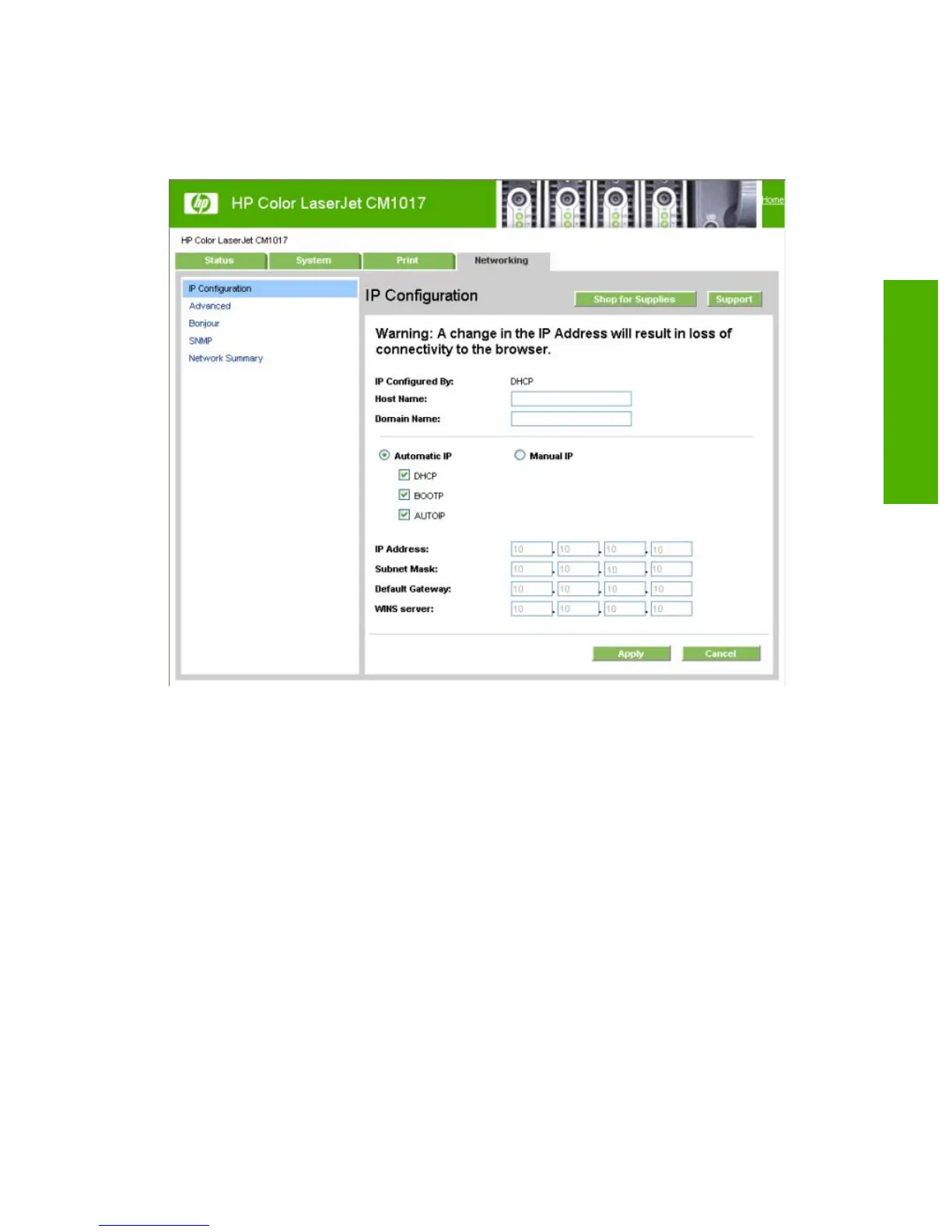 Use the IP Configuration page to configure the IP address and host and domain names for the HP Color
