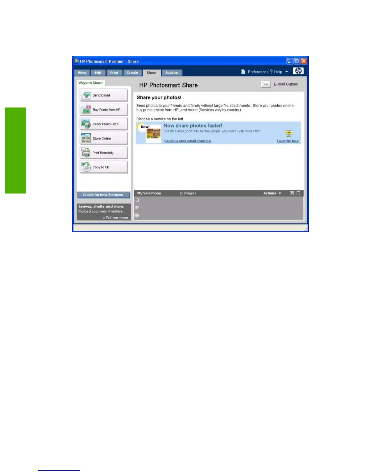 Share. Select the Share tab to share photos through e-mail, online albums, and for online photo-