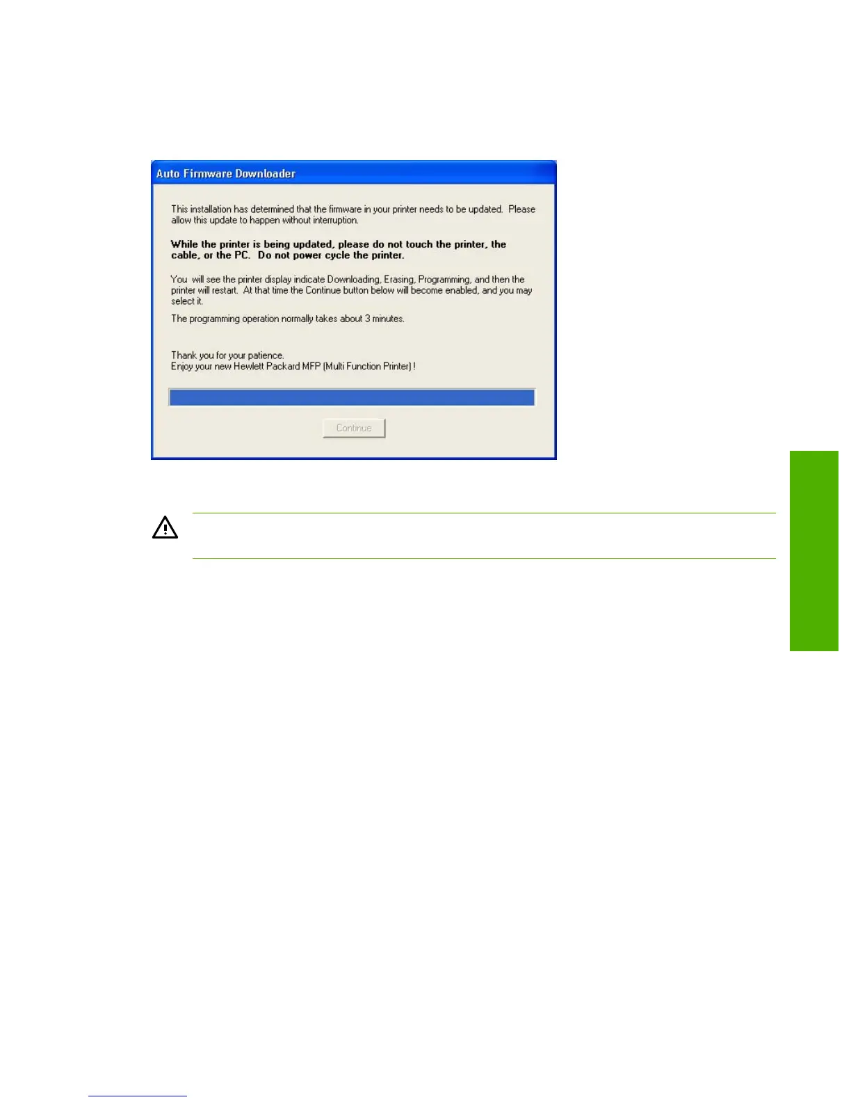 WARNING! Do not touch the printer, the printer cable, or the computer during the firmware